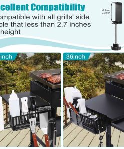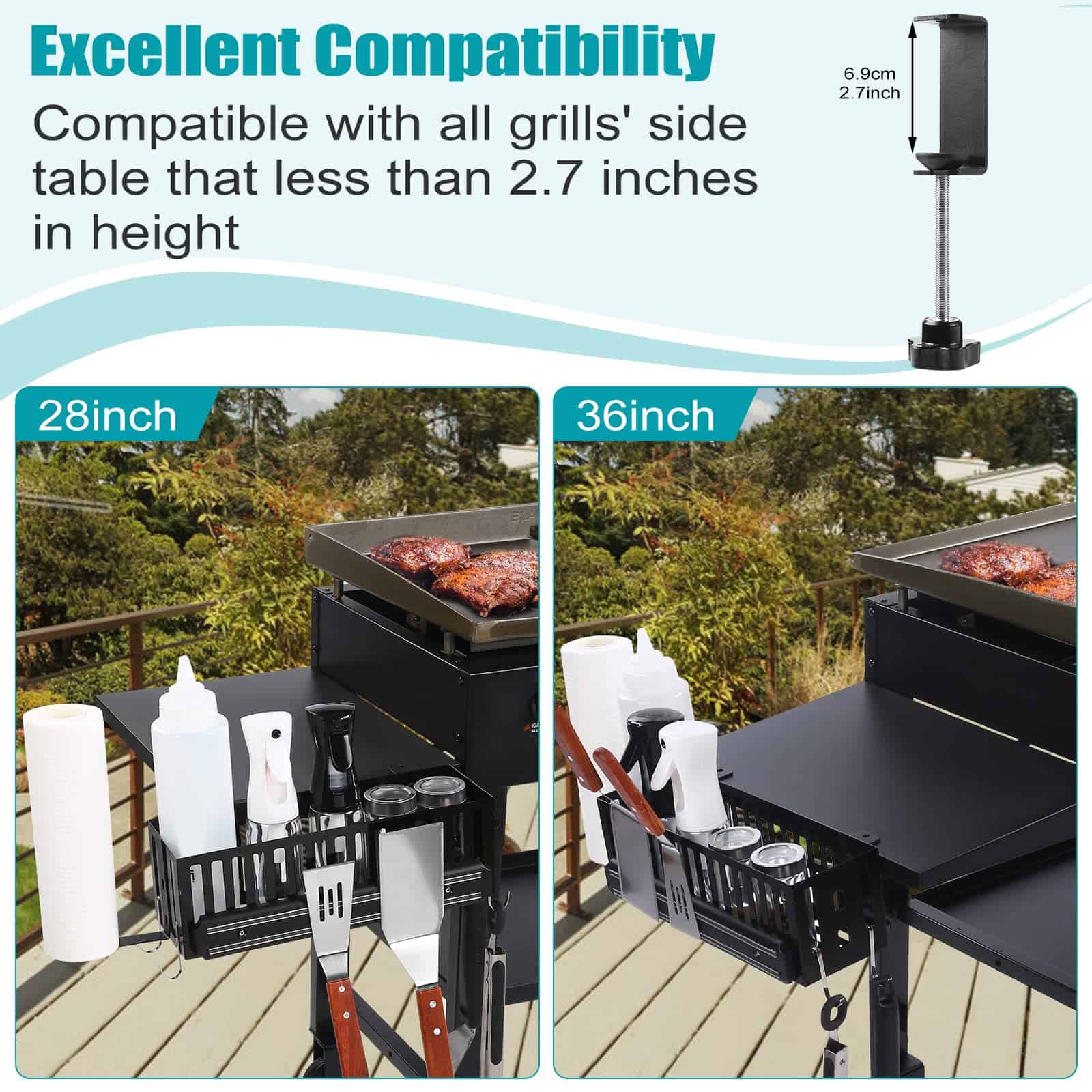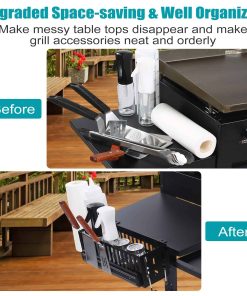4. Caddy Organizador para Parrilla Exterior: Nuestro caddy de herramientas para parrilla exterior no solo es compatible con las planchas Blackstone de 28 pulgadas/36 pulgadas sino que también es adecuado para mostradores de hasta 2.7″ de grosor. Es fácil de instalar y usar, y compatible con una variedad de estantes laterales, mesas y mostradores.