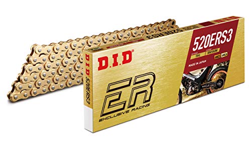 Tipo de cadena, Clasificación de cadena todoterreno, Número de cadena todoterreno, 520ERS3 Número de eslabones, 110 Color, Oro Número, 079132 Oro/Oro Cadena de carreras exclusiva de alto rendimiento Cadena ligera Resistencia a la tensión de 8,660 Lbs./Ft. Suministrada con enlace de remache