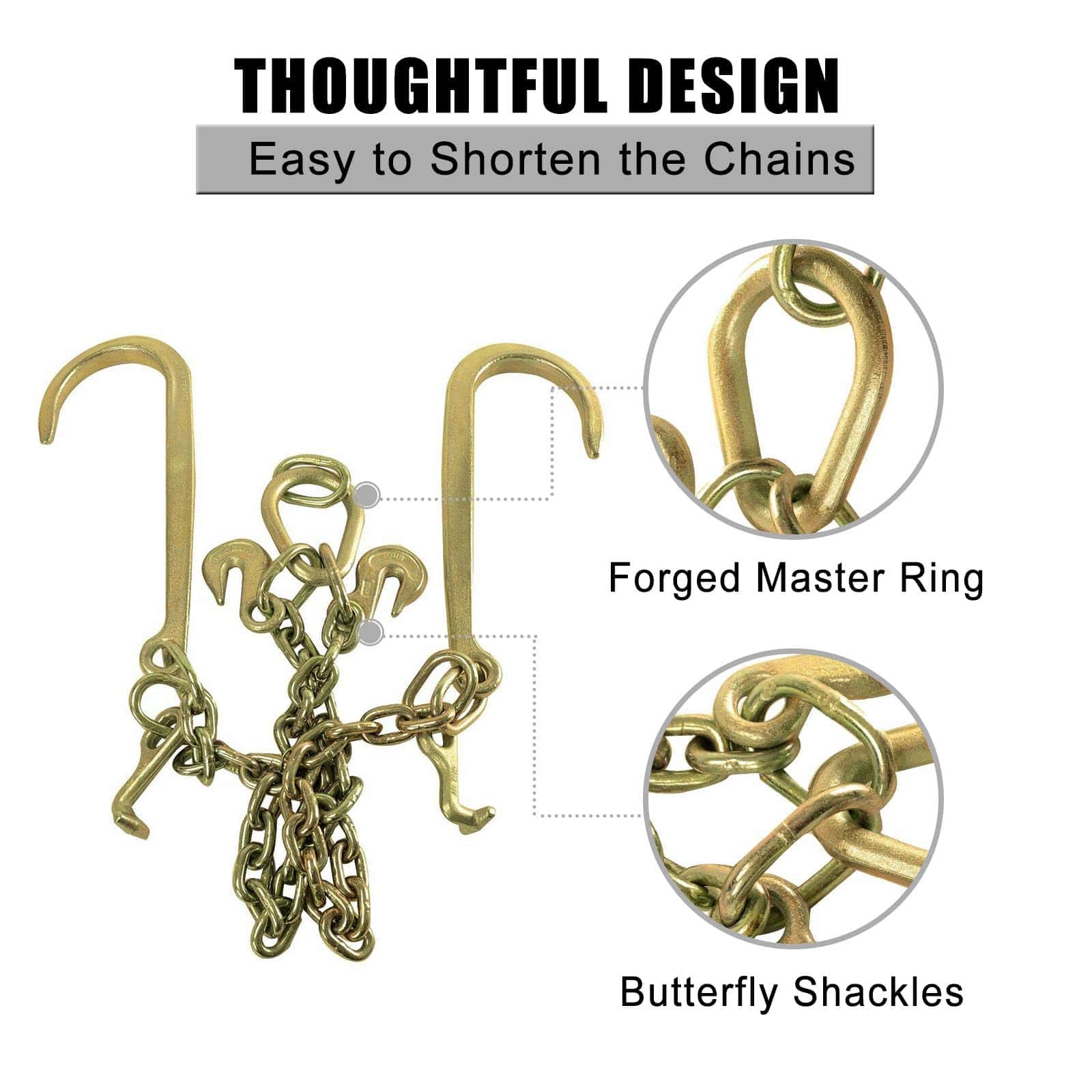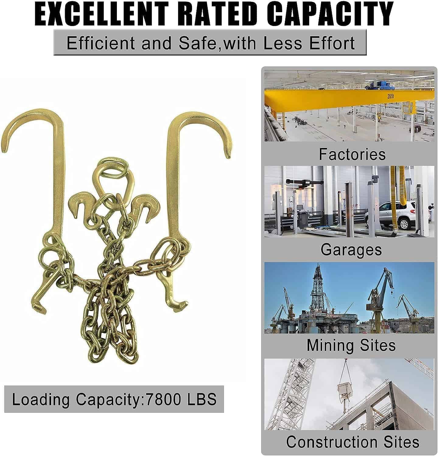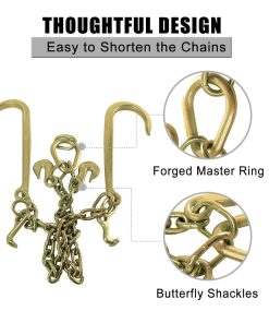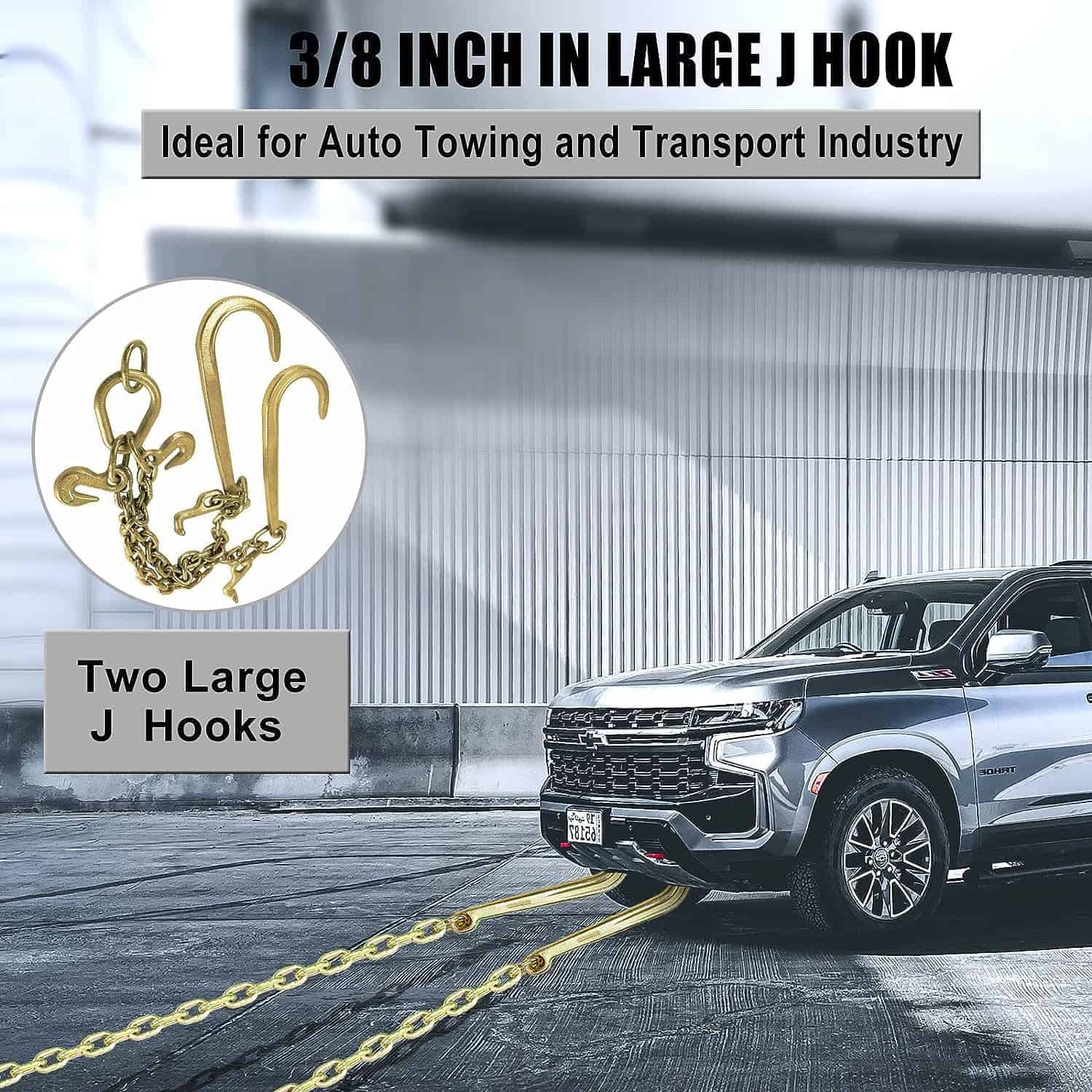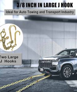 Descripción: Diseñada para el levantamiento de carga de manera segura, fácil y eficiente. Duradero y con larga vida útil. Resistente cadena de remolque para trabajo pesado. Material premium de grado industrial. 100% nuevo, nunca ha sido probado ni instalado. Gancho en J compacto, color electrogalvanizado: Oro. Tamaño: Cadena de 3/8″. Longitud de la cadena: 2 pies en cada lado. Longitud de la espiga: 15 pulgadas. Material: Acero G70. Carga total segura: 7,800 lbs. Peso del producto: 14.68 lbs. No necesita modificaciones. Se recomienda la instalación profesional. Incluye: 1 cadena de remolque como se muestra en la imagen.