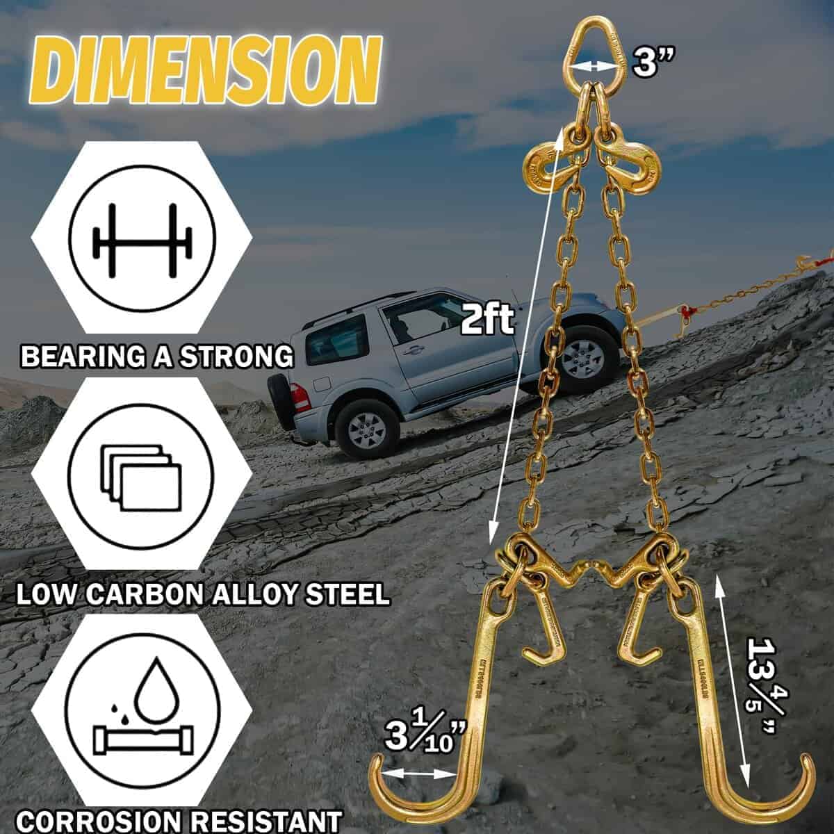 La cadena de remolque en V de SENKEYFE G80-5/16 � 2 pies con 15 pulgadas de ganchos en J y ganchos de tracción es perfecta para el remolque de vehículos con seguridad y eficiencia. Hecho con materiales de grado industrial de alta calidad y tecnología de forjado avanzada, esta cadena de gancho en J tiene una vida útil más larga y una soldadura más fuerte. La superficie galvanizada en color le proporciona resistencia al óxido, a la corrosión y al desgaste para un rendimiento duradero. Equipado con ganchos en J de 15 pulgadas y ganchos de combinación T-J ajustables, esta cadena de remolque es fácil de usar y se adapta a una variedad de configuraciones de vehículos. Con una aplicación amplia en ataduras, tracción, construcción, industria y más, esta cadena de remolque G80 es un compañero confiable para su trabajo. Cada cadena y gancho de SENKEYFE está marcado adecuadamente y cumple con las especificaciones DOT y CSVA para facilitar todas las inspecciones en carretera. Confíe en SENKEYFE para proporcionarle los mejores productos de cadenas de remolque para sus necesidades de remolque.