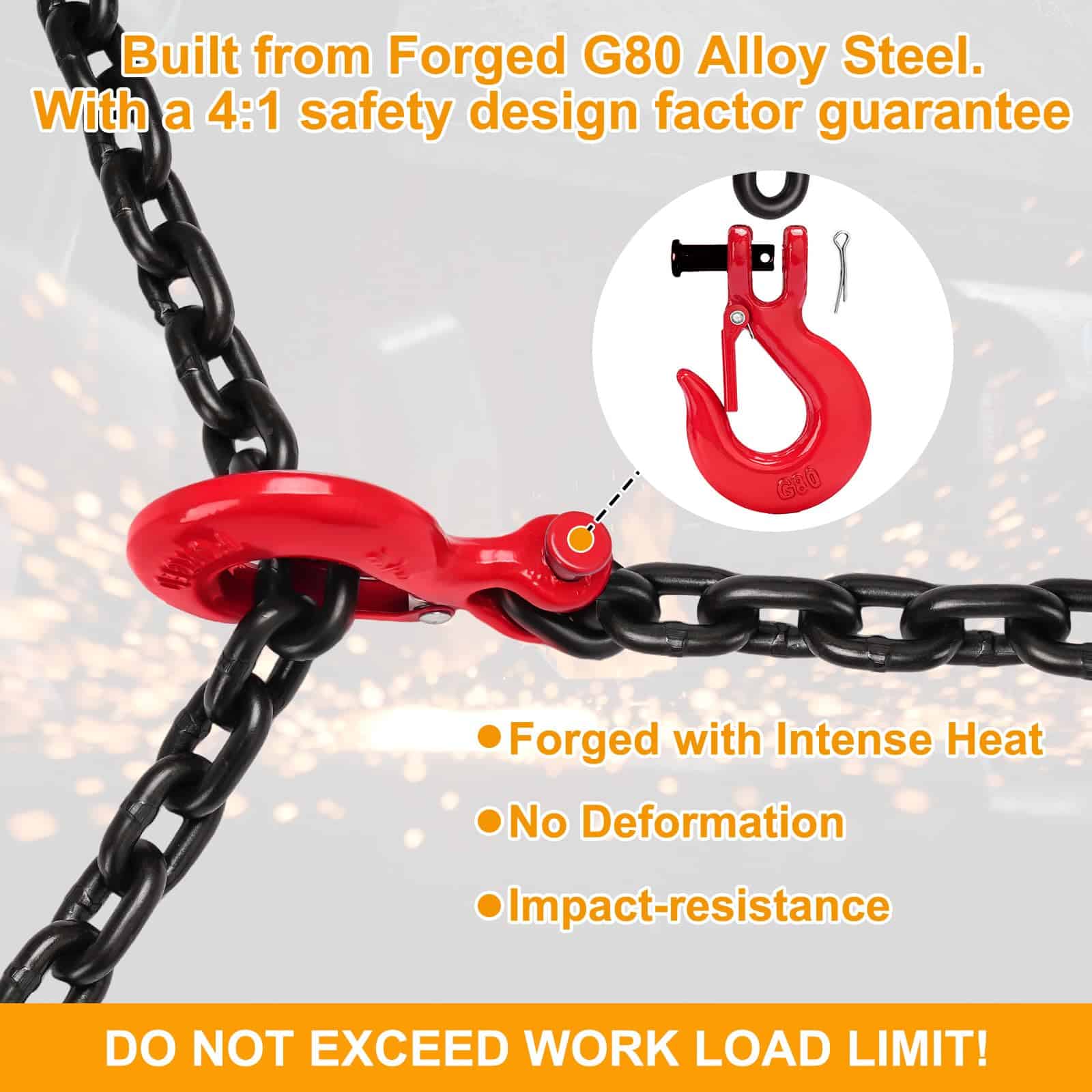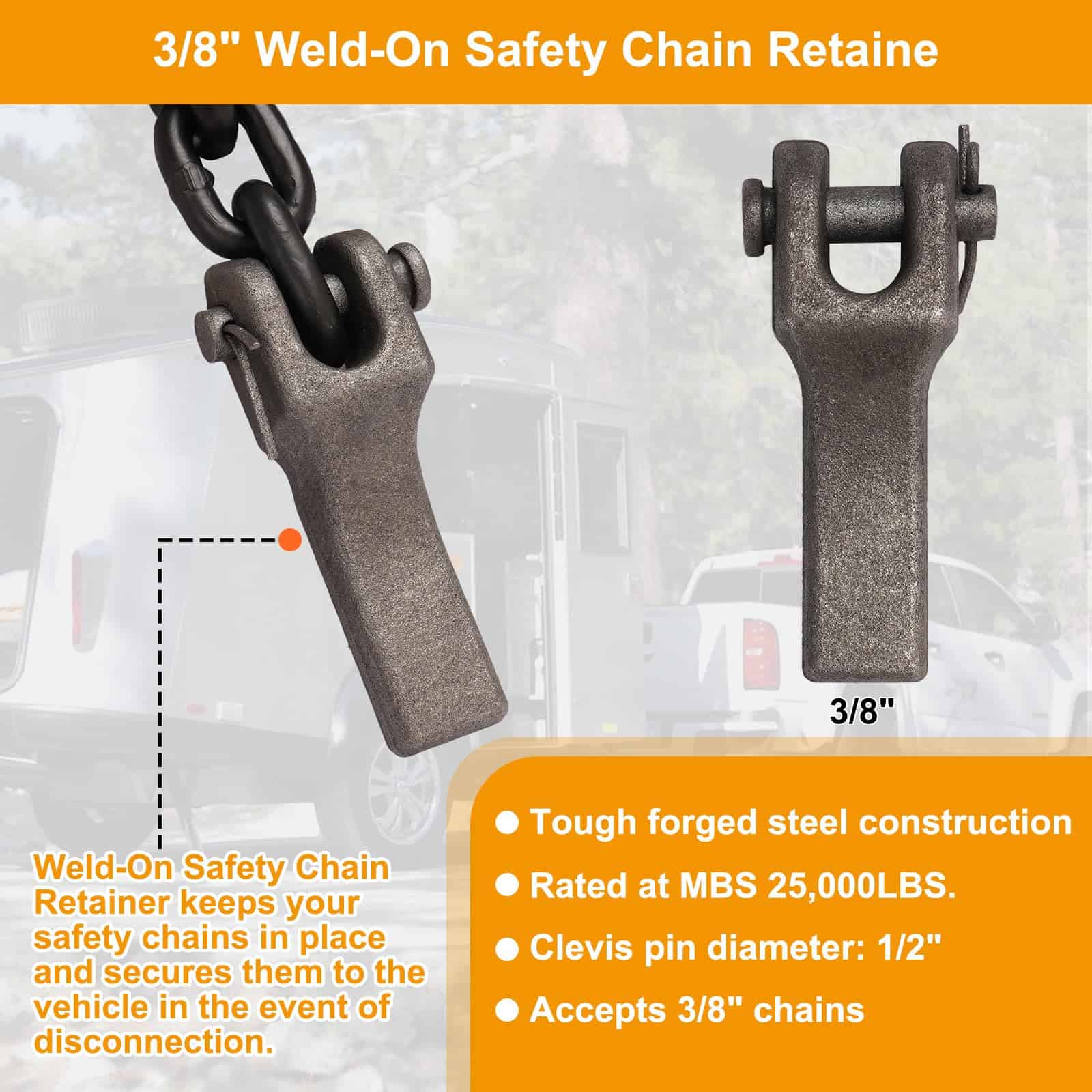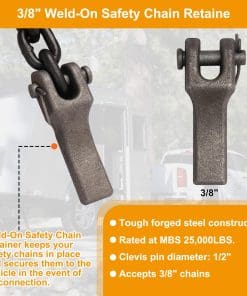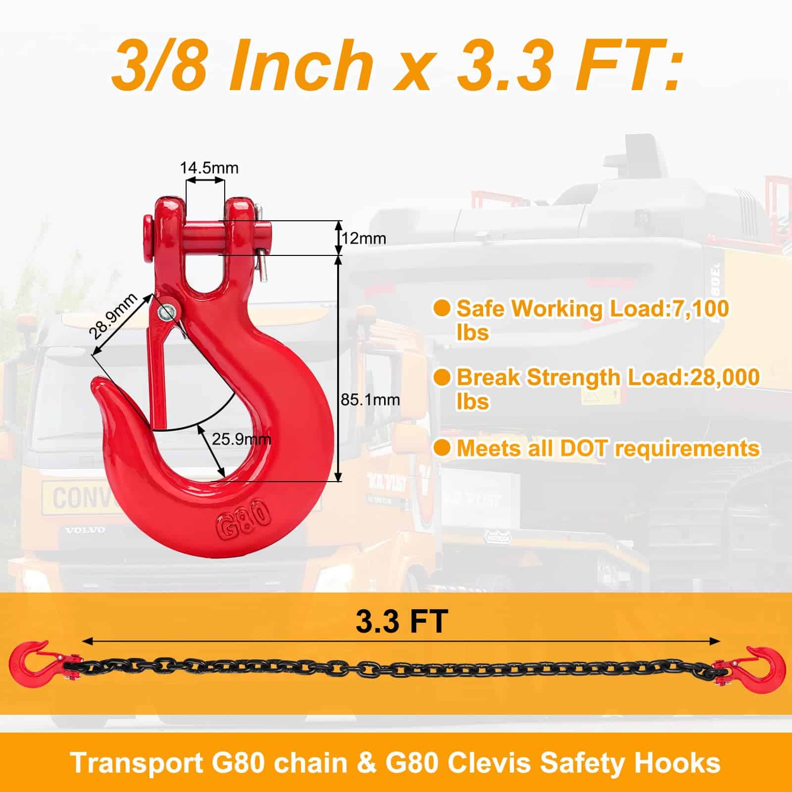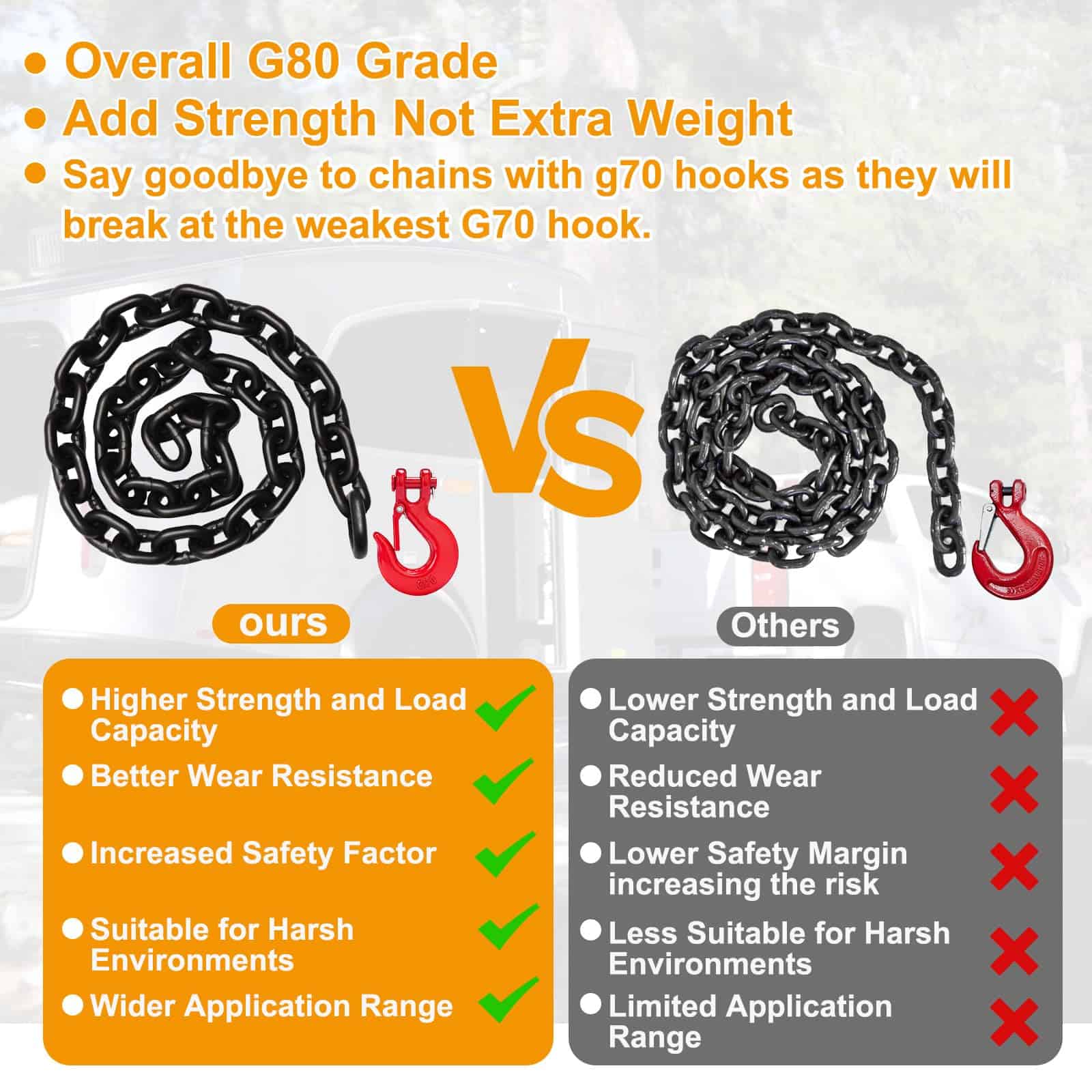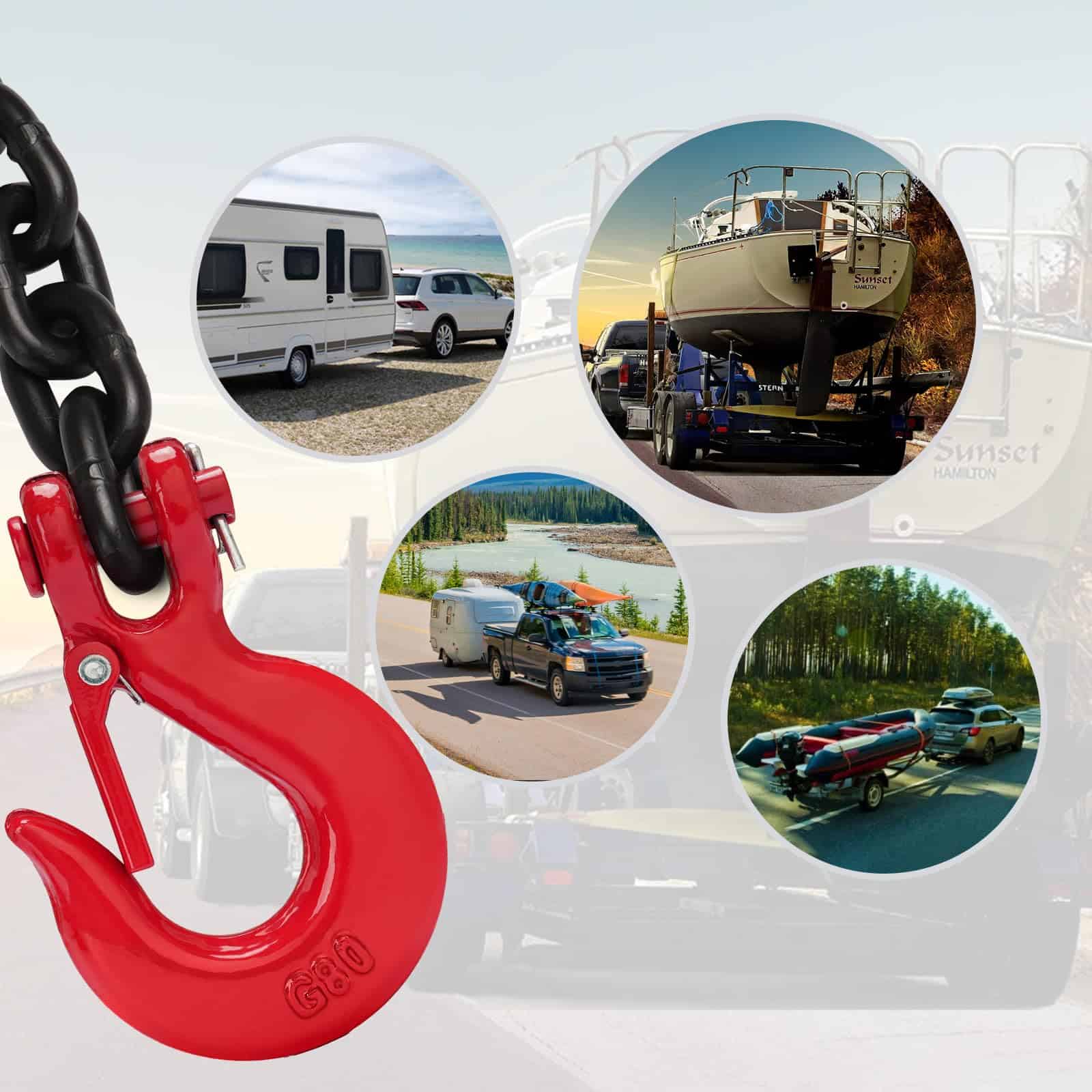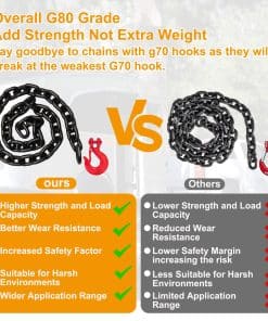 1. Cadenas de Seguridad G80 Potentes: Fabricadas con acero de aleación tratado térmicamente de alta resistencia, nuestra cadena de remolque de servicio pesado con ganchos es más resistente a la oxidación y corrosión que las cadenas estándar de grado G70 inferiores. 2.4:1 factor de diseño de seguridad, que garantiza durabilidad y fiabilidad incluso para los trabajos más duros. 2. Conexión Segura: Diseñado para conectar desde su remolque a su vehículo para ayudar a resistir la separación completa entre vehículo y remolque durante una desconexión. Y el retén de cadena tiene un pasador y cotter plateado de zinc removible para una fácil instalación y reemplazo de la cadena. Resistente a la oxidación y corrosión a pesar de los elementos exteriores. 3. Acabado en Negro Galvanizado: El tratamiento de superficie galvanizado en color protege contra la corrosión y el desgaste, manteniendo una buena condición durante el uso en entornos adversos. Y nuestros ganchos de remolque son fáciles de identificar y mejoran la visibilidad durante el remolque con un color rojo brillante, mejorando significativamente la seguridad en el trabajo industrial. 4. Versátil Para Camiones: Las cadenas de remolque con ganchos pueden utilizarse para varios tipos de camiones, incluidos cuello de ganso, camiones semirremolque y remolques de tractor. Nuestras cadenas de grado 80 y ganchos de cadena están marcados ambos para cumplir con los estándares NACM, puedes tener la seguridad de usarlos y cumplen con cualquier examen de la policía de tránsito (¡Cada cadena de seguridad debe cumplir o exceder el peso bruto del remolque!). 5. Amplia Aplicación: Esta cadena de seguridad para remolque con ganchos de agarre está diseñada para asegurar cargas pesadas en remolques planos y camiones. También son adecuados para cargas fijas en transporte, agricultura e industria. Ya sea asegurando mercancías en un camión o un remolque plano y apoyando tus tareas más pesadas, proporcionando una solución completa de paletización.
