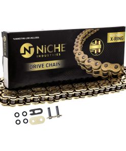 La Cadena de Transmisión NICHE Gold 428 X-Ring con 112 Enlaces y Enlace Maestro de Conexión es perfecta para los motociclistas que buscan el máximo rendimiento en cualquier tipo de condiciones. Con un paso de 428 y 112 enlaces, esta cadena está diseñada para brindar durabilidad y resistencia superiores. Los anillos X premium ofrecen una reducción de la fricción de la cadena, prolongando la vida útil del sello y mejorando su rendimiento. Fabricada con pasadores cuádruples rebordeados, componentes de acero endurecido y anillos X de NBR premium, la cadena de transmisión X-Ring de Niche es una alternativa de alto rendimiento a las cadenas OEM estándar. Además, es compatible con OEMs Honda 40530-K28-911; Kawasaki 92057-1099; Suzuki 27600-20911-112. Asegúrese de consultar las especificaciones recomendadas por el fabricante antes de instalar este producto y, en caso de dudas, contacte a un profesional certificado para su instalación.