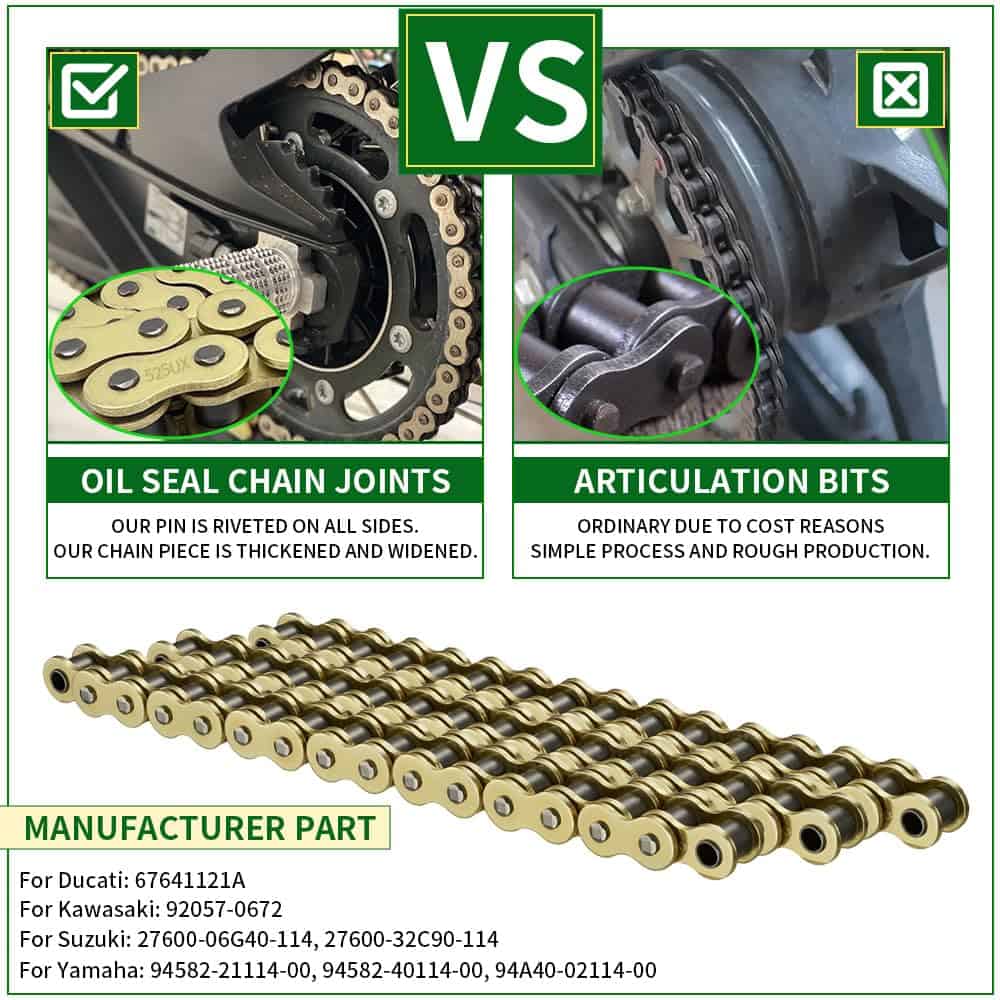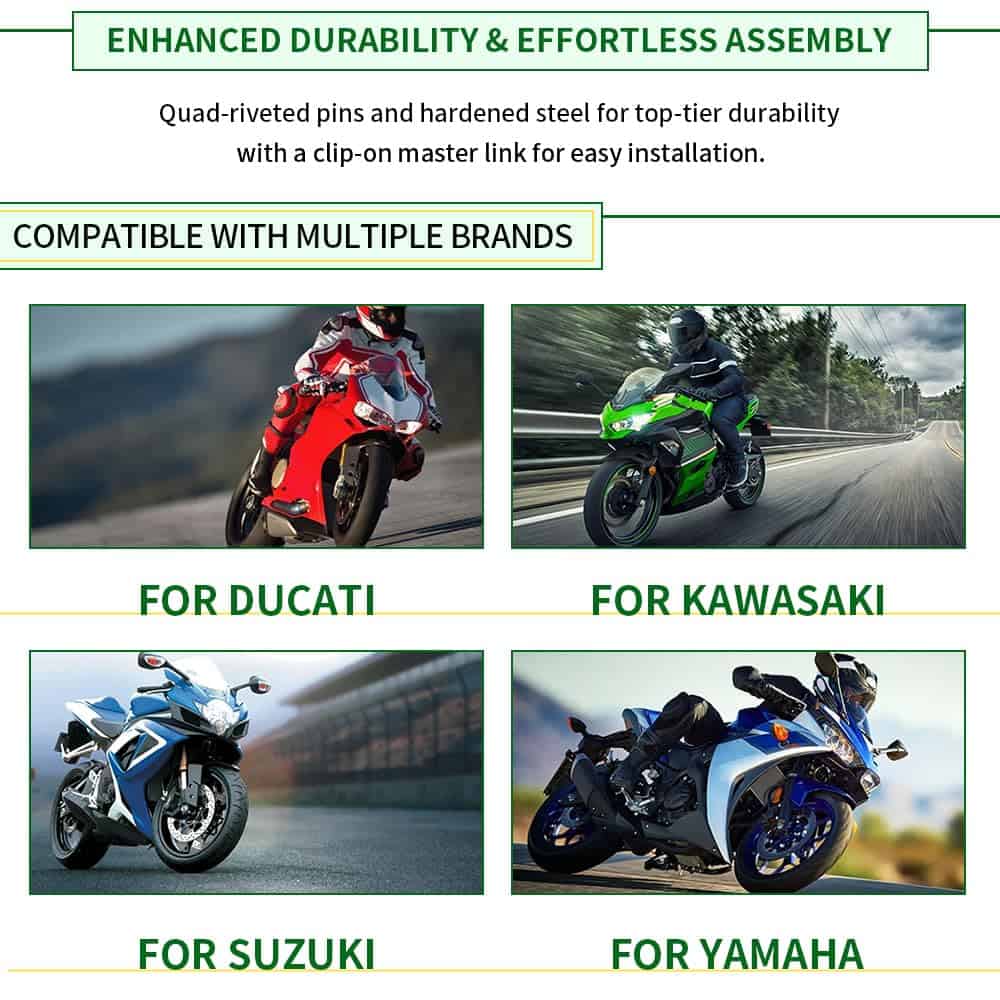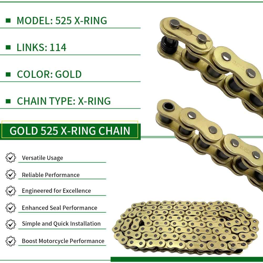 Nuestra Cadena Gold 525 X-Ring no se trata solo de resistencia; también ofrece conveniencia. El enlace maestro incluido con un clip permite una instalación sencilla, lo que la convierte en una actualización sencilla sobre su cadena OEM, haciéndola una elección versátil para varios modelos de motocicletas.