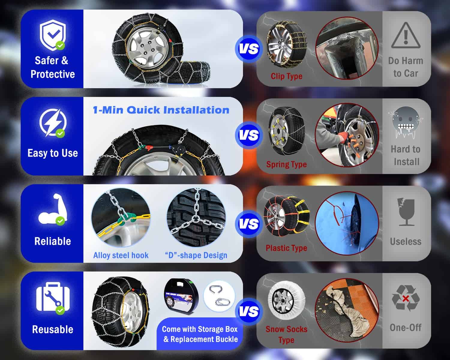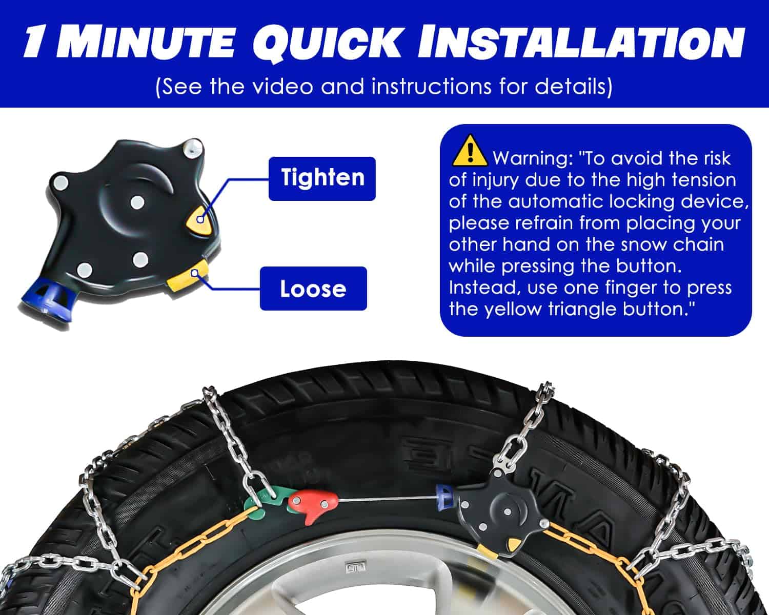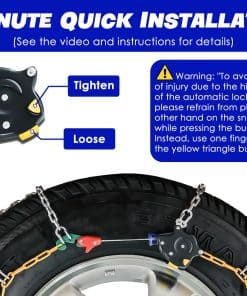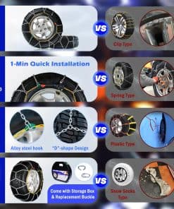 Instalación sencilla: Instalación rápida de 1 minuto sin necesidad de mover el vehículo y fácil de quitar. Dispositivo de autoajuste: ¡Haga clic y listo! Simplifique su viaje sin aprietacables de goma y sin necesidad de detenerse para volver a apretar después de la instalación. Duradero y confiable: Fabricadas con acero de manganeso aleado grueso, nuestras cadenas de nieve ofrecen tracción y agarre excepcionales en la nieve, barro, arena e hielo, garantizando su seguridad. Fácil de limpiar y almacenar: Después de su viaje, simplemente enjuague la cadena y déjela secar al sol. Nuestro producto viene con una caja de almacenamiento conveniente que le permite guardar fácilmente en su automóvil para usos futuros. Contenido del paquete: 1 par de cadenas de nieve, 1 par de guantes de algodón, hebillas de repuesto y guía del usuario. Se adapta a tamaños de neumáticos: 215/55 R16, 215/60 R16, 225/55 R16, 215/55 R17, 225/50 R17, 235/45 R17, 225/40 R18, 225/45 R18, 225/40 R19
