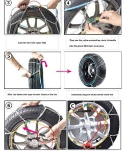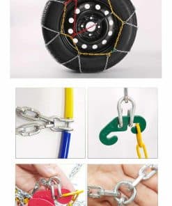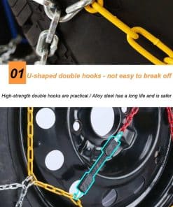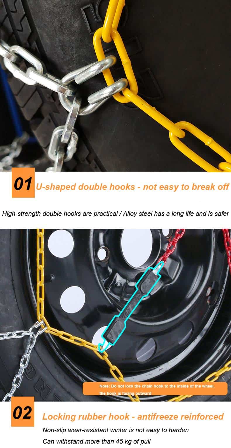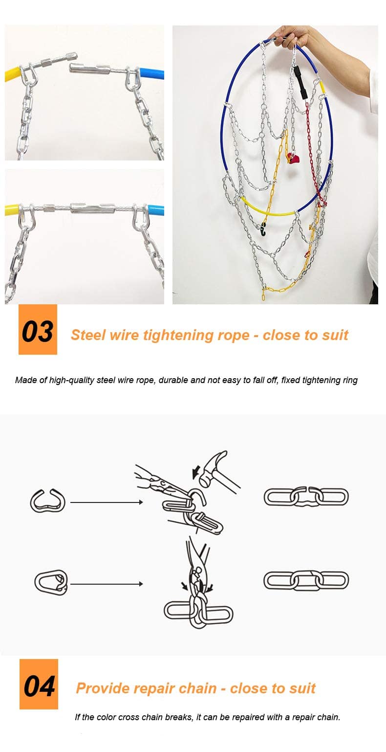 3. Fácil de Instalar Instalación rápida. No es necesario utilizar gato u otras herramientas para instalar las cadenas de nieve del coche. Cuando se instalan, no es necesario mover las ruedas para el ajuste. Después de instalar todas las cadenas de nieve, conduzca el coche unos 100 metros y luego enganche la cadena amarilla con un gancho de goma para lograr un efecto de tensión.