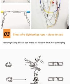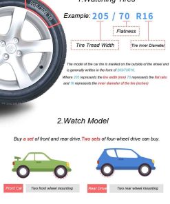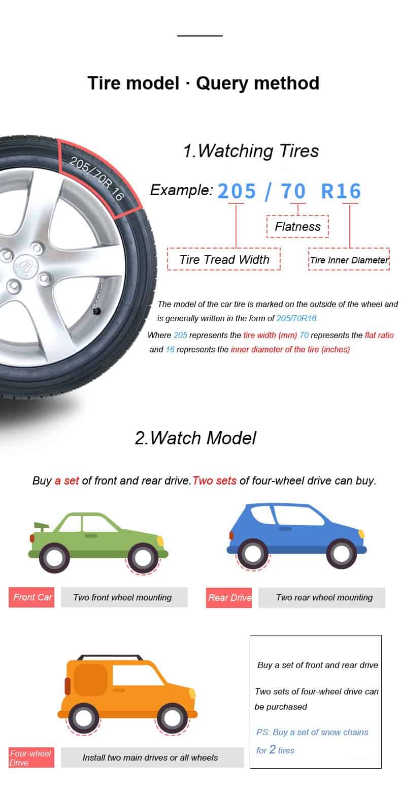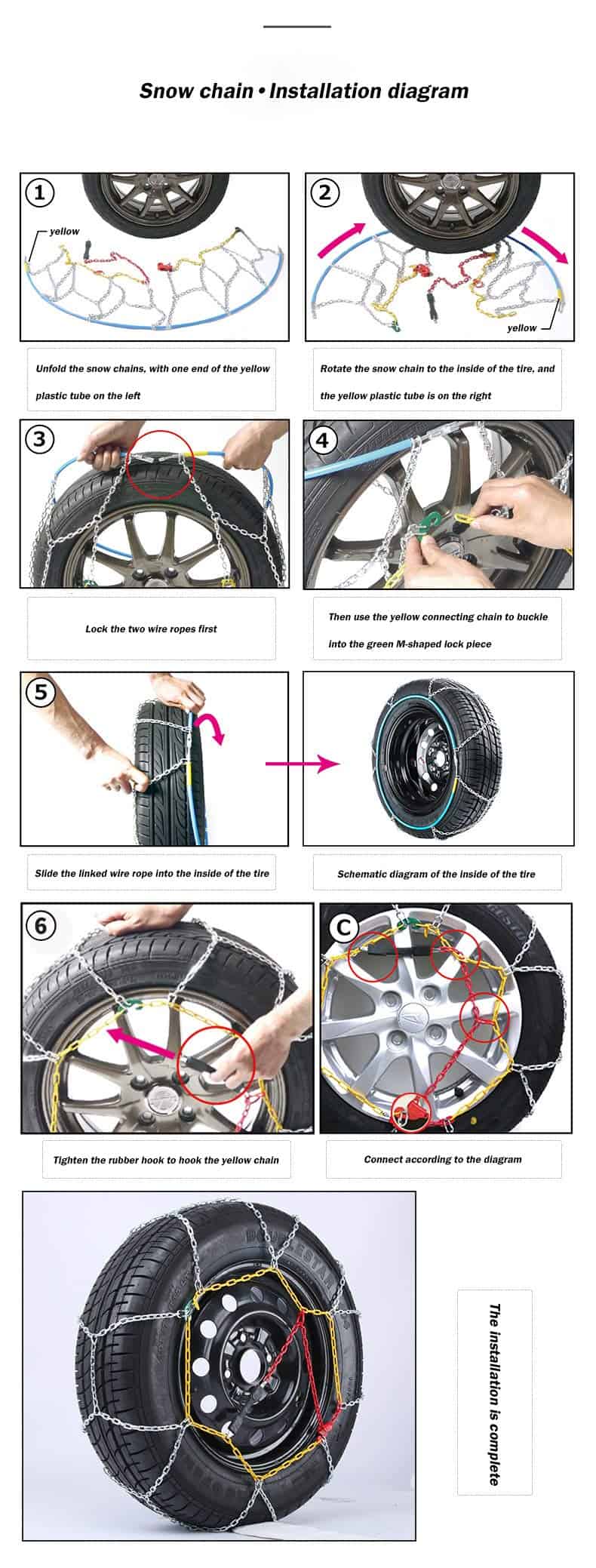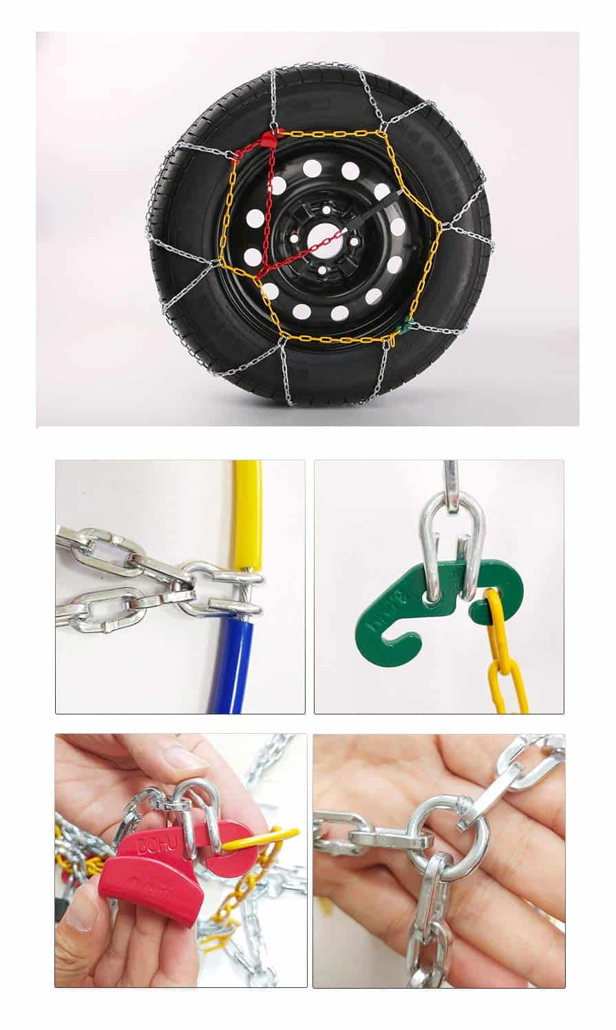 3. Fácil de Instalar Instalación rápida. No es necesario utilizar gato u otras herramientas para instalar las cadenas de nieve del coche. Cuando se instalan, no es necesario mover las ruedas para el ajuste. Después de instalar todas las cadenas de nieve, conduzca el coche unos 100 metros y luego enganche la cadena amarilla con un gancho de goma para lograr un efecto de tensión.