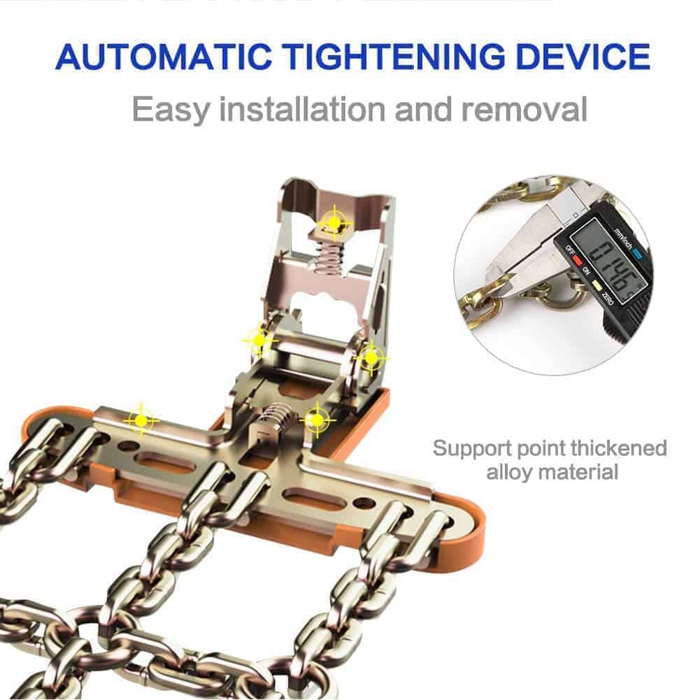 Además, las cadenas de nieve vienen con un tensor automático mejorado que facilita su instalación sin necesidad de utilizar herramientas. Los extremos de las cadenas están cubiertos con material de almohadilla de tendón de TPU grueso de alta calidad para evitar el desgaste del neumático y la rueda, garantizando un ajuste perfecto con la rueda. La correa de apriete de ingeniería de grado garantiza resistencia y durabilidad, siendo resistente a la tensión y la abrasión.