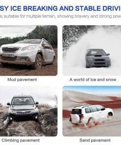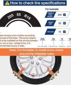 Para verificar si las cadenas son adecuadas para sus neumáticos, simplemente compruebe una cadena en el neumático para describir la especificación. Este producto es solo aplicable a neumáticos con un ancho de 195-235 mm, lo que los hace adecuados para la mayoría de los coches. Recuerde que no se deben realizar frenadas de emergencia al usar las cadenas y la velocidad del vehículo no debe exceder los 40 km/h.