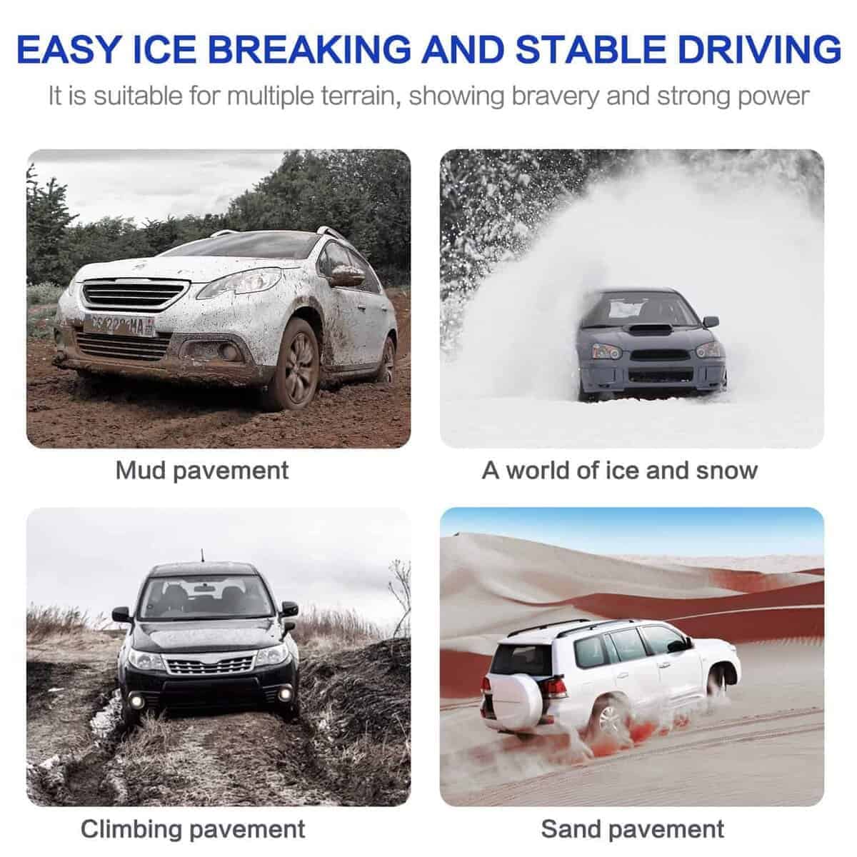 Las Cadenas de Nieve de Emergencia AutoChoice son la solución perfecta para condiciones climáticas extremas como hielo, nieve, arena y barro. Fabricadas con acero de manganeso engrosado de alta calidad, cada cadena de nieve para coche está compuesta por 5 cadenas gruesas que garantizan un fuerte agarre, resistencia al deslizamiento y capacidad antideslizante. El diseño científico de entrelazado de malla proporciona una conducción suave y una excelente resistencia al deslizamiento.