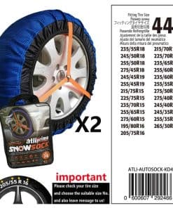 Conduzca de manera segura a velocidades de hasta 50 km/h (si las condiciones lo permiten). Su instalación es fácil. Son livianas y ocupan un espacio mínimo. Manténgalas siempre en el auto para un uso futuro. Son reutilizables y tienen un buen valor. Son una solución simple a un problema difícil. Cómo funcionan los calcetines para nieve: Simplemente, el tejido se adhiere a la nieve y al hielo. El tejido tejido está diseñado para garantizar el máximo agarre en la nieve y el hielo. Contenido: Un par de Calcetines para Nieve en una bolsa de almacenamiento. – Un par de guantes para proteger tus manos cuando los colocas en condiciones húmedas y sucias. Adecuado para: Todos los automóviles de pasajeros con base en el tamaño de sus llantas. Cuando compre, verifique el tamaño de sus llantas y compre el número de stock adecuado.