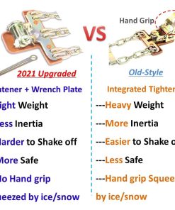 Paquete incluido: 1 pala de nieve 2 placas de llave 6 cadenas de neumáticos de hierro 1 bolsa de almacenamiento duradera 1 par de guantes de montar Instrucciones de instalación Tarjeta de servicio postventa