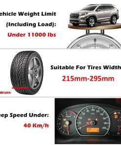 Atención: Ante todo, las cadenas para neumáticos de nieve no pueden garantizar todo. La precaución es lo más importante durante la conducción. Mantenga la velocidad por debajo de 40 km/h No frene bruscamente ni haga giros bruscos Para neumáticos de ancho 225-285 mm Si las cadenas en los tacones se caen, por favor, deje de usarlas inmediatamente No ponga cadenas en ruedas de hierro Evite su uso en objetos afilados, pavimentos secos o terreno plano Deje de usar cuando sienta ruidos anormales Después de usar, lave las cadenas con agua tibia No use cuando el desgaste de la cadena sea superior al 30% Evite instalar cadenas cerca de la abertura de carga Consulte el manual de instrucciones al instalar
