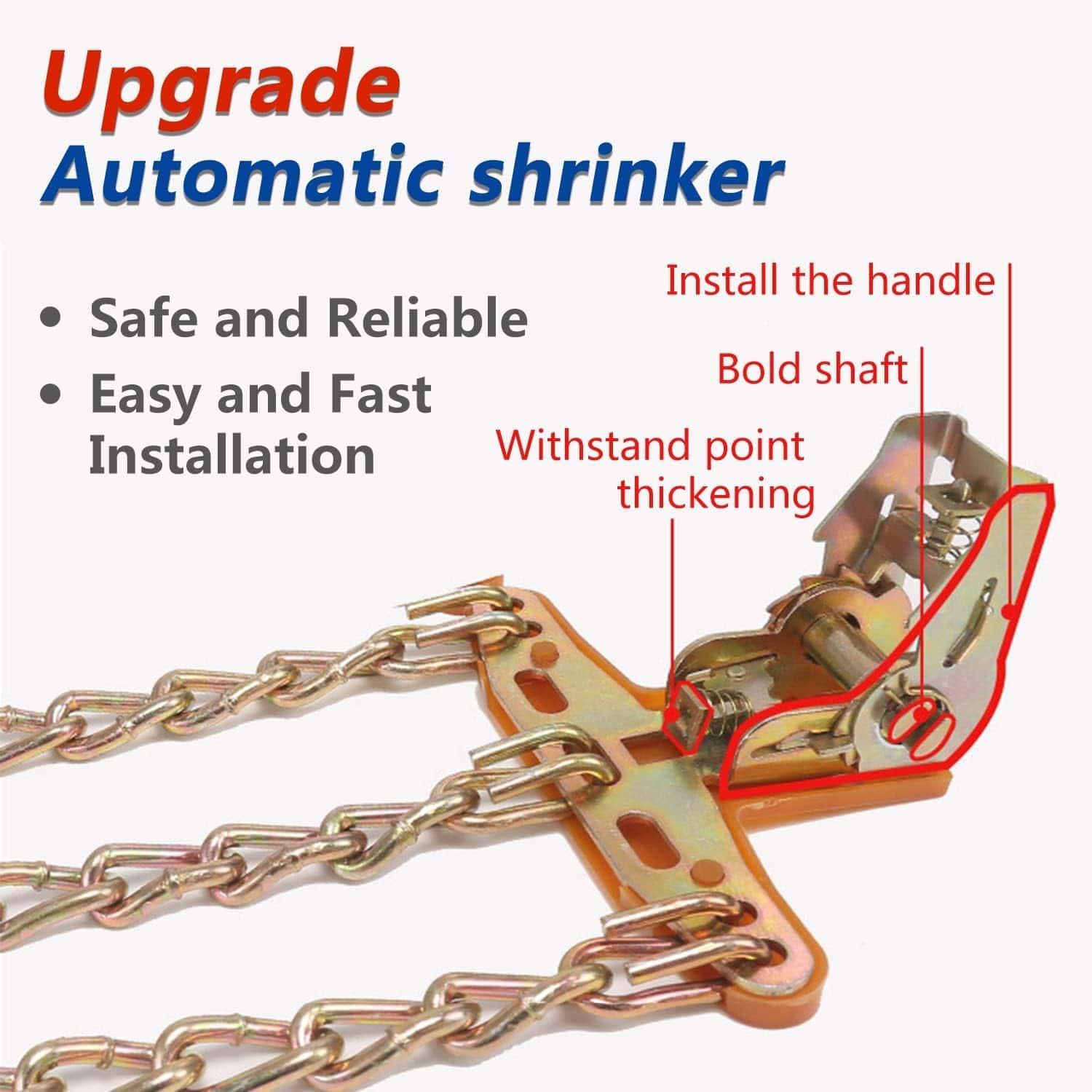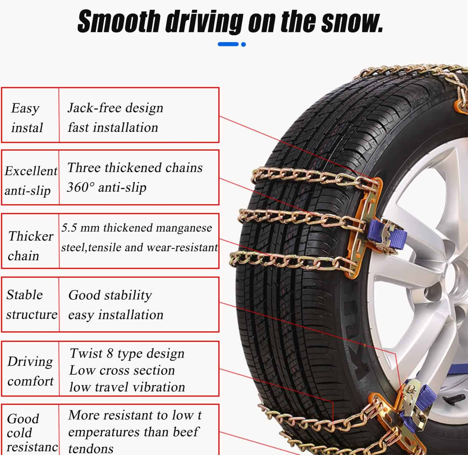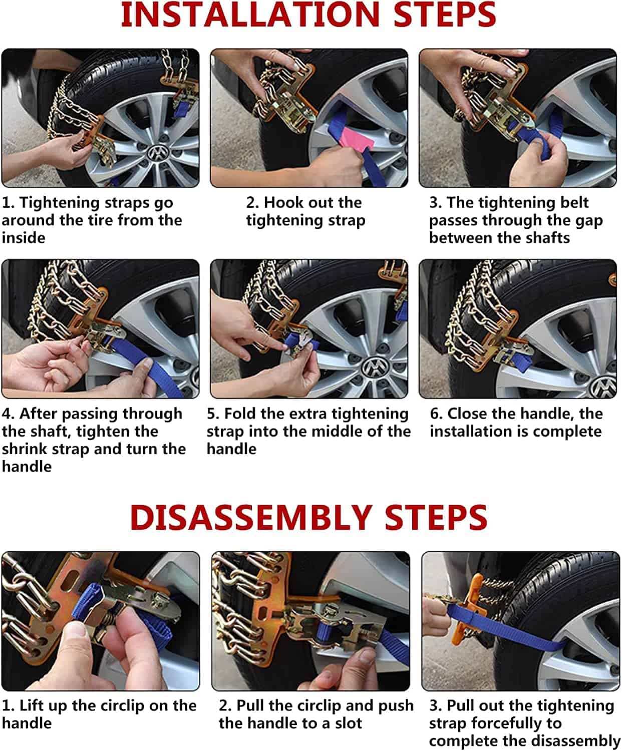 2, Después de instalar las cadenas y conducir cientos de metros, apriete nuevamente las cadenas.