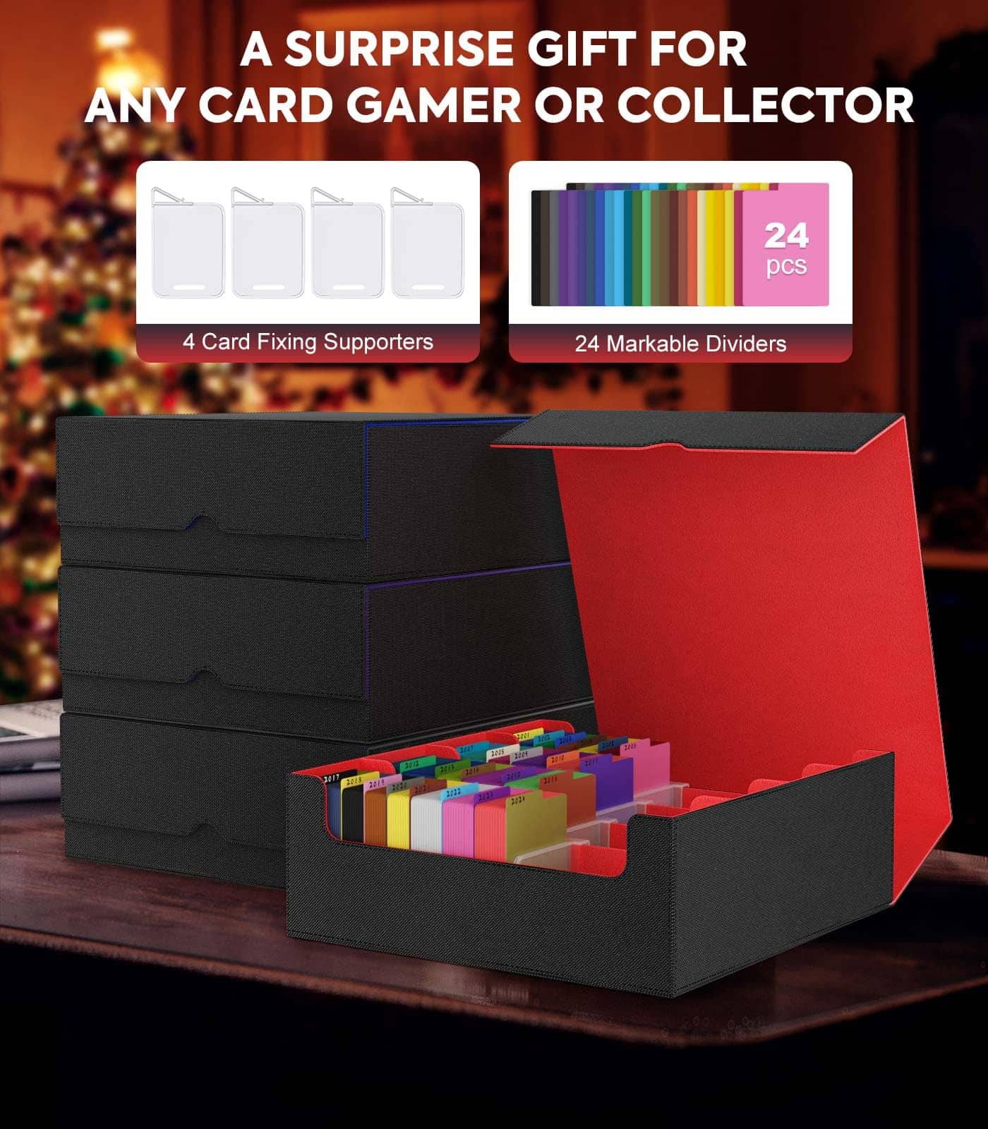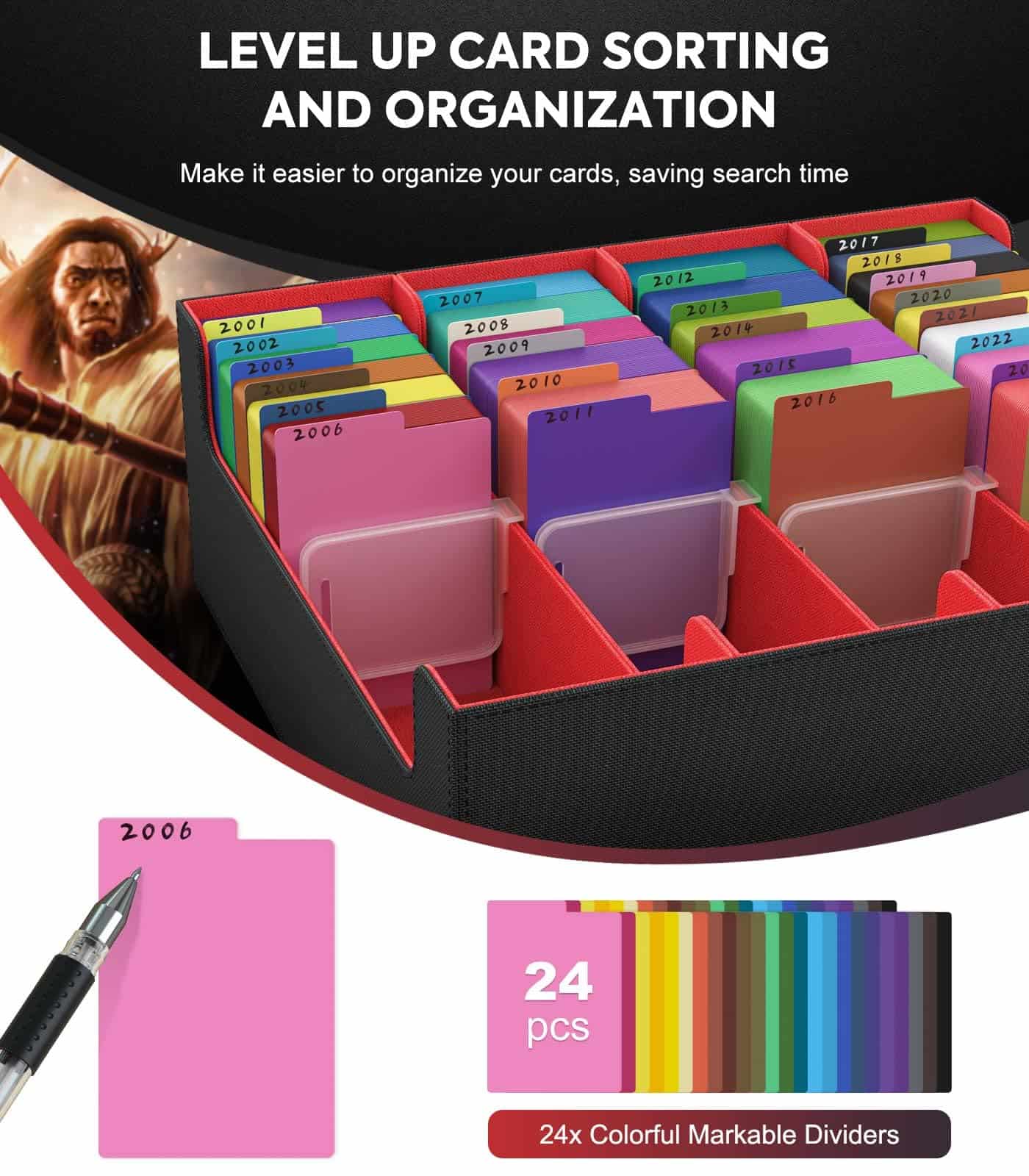Viene con 24 pestañas de separador coloridas y 4 soportes de cartas para ayudarte a separar diferentes tipos de cartas de juego, facilitando su organización y clasificación.
