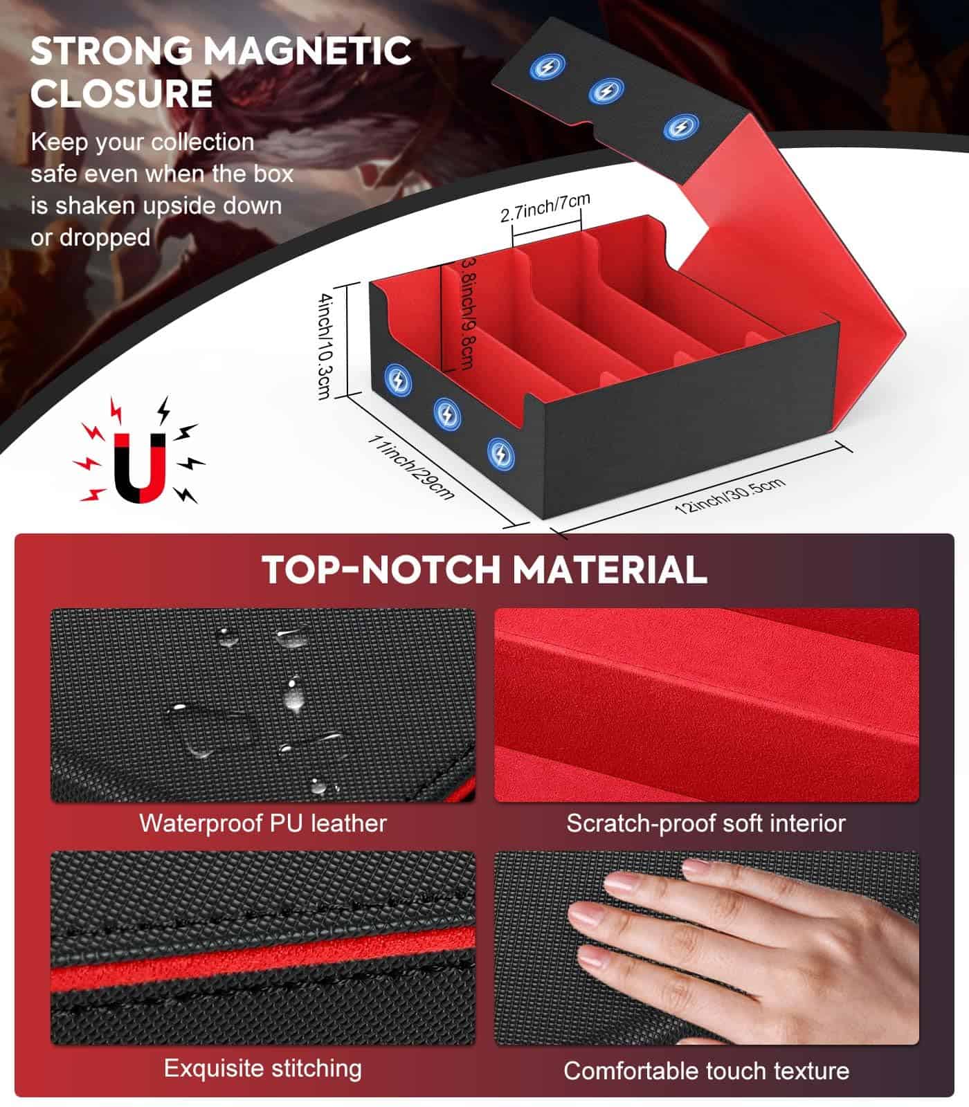 Nuestra caja de almacenamiento de mtg tiene un diseño de cierre magnético, y la fuerte succión del imán puede mantener la caja cerrada muy bien.