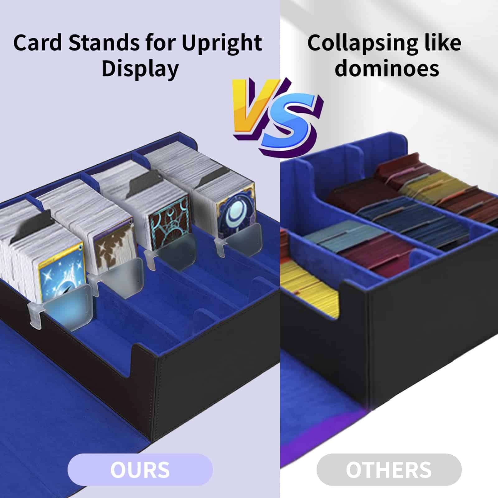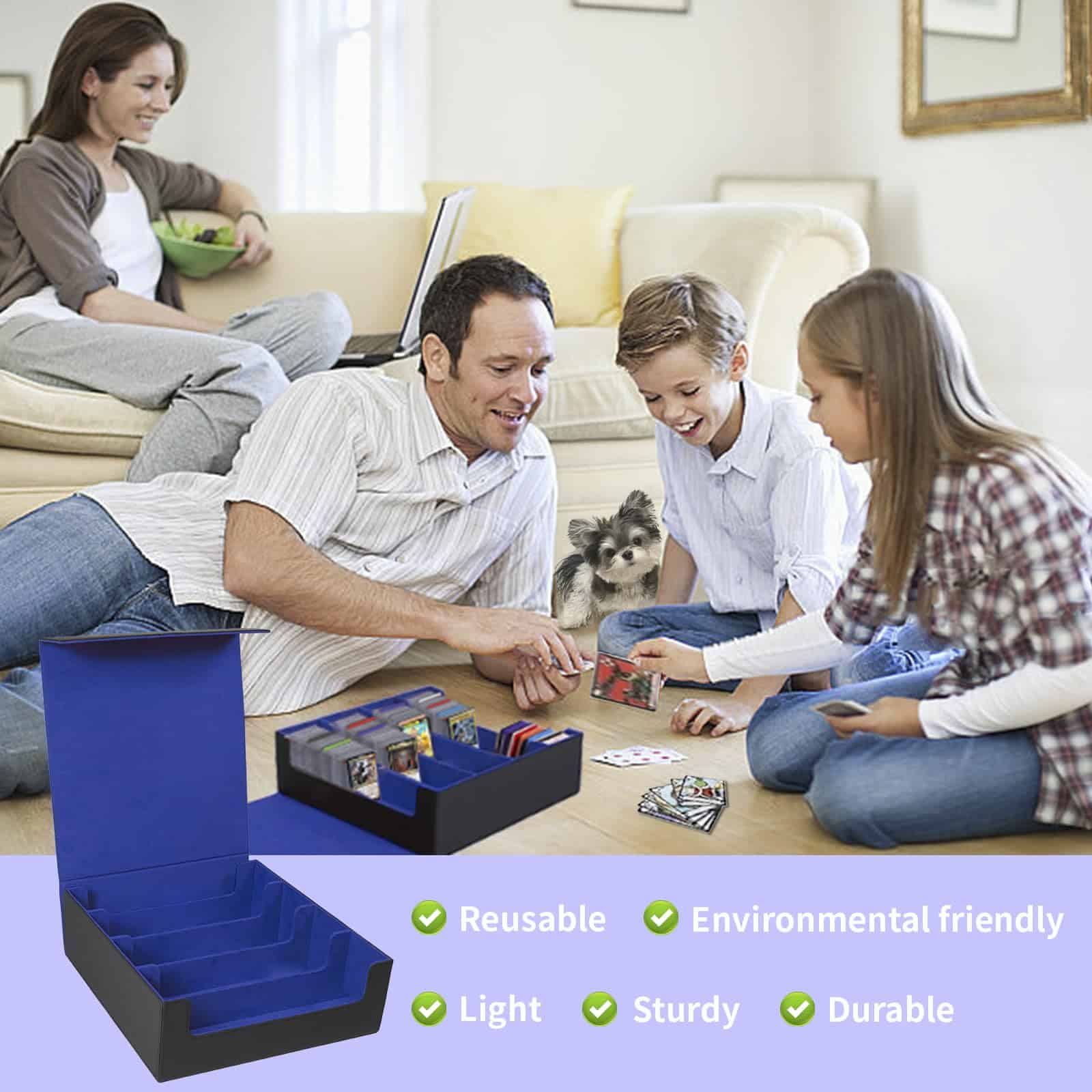 4. Caja de almacenamiento de cartas: La caja de cartas de intercambio evita que tus cartas valiosas se colapsen. Cuando la caja de mazo comandante no está completamente llena, estos soportes aseguran que tus cartas se mantengan en posición vertical, evitando daños y caídas en efecto dominó. Esta función de soporte de almacenamiento de cartas de intercambio conserva la condición de tus cartas y puede acomodar varios tipos de cartas: The Gathering, Dragon Shield, One Piece, Duel Masters y cartas deportivas como fútbol, baloncesto y béisbol en fundas de protección y más.