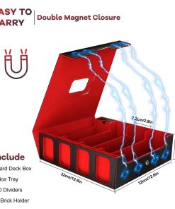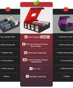 1. Calidad Premium – Resistente y Duradero: Nuestra caja de mazos de cartas Gomyrod está fabricada con cuero PU resistente al agua y un interior de microfibra suave. Ya sea que tus cartas estén enfundadas o no, este estuche de cartas proporciona una protección de primera categoría, manteniéndolas a salvo de arañazos, pliegues y otros daños. Perfecto para asegurar que tus valiosas cartas permanezcan en condiciones prístinas. 2. Capacidad de 4 Filas y 3200+: Con un diseño mejorado de 4 filas, esta caja de almacenamiento de cartas de intercambio aumenta la capacidad en un 33.3%. Con unas dimensiones de 12.6 x 12.6 x 3.9 pulgadas, alberga más de 3200+ cartas sin enfundar, 2200+ cartas con una sola funda, o 1800 cartas doble-fundas de tamaño estándar. Además, la caja de mazos de comandante cuenta con 4 ranuras de visualización para las cartas coleccionables, cada una viene con un soporte de ladrillo acrílico y fundas para cartas, brindando una vista previa fácil del contenido. 3. Diseño Portátil con Asa de Transporte: Diseñada pensando en la conveniencia, la caja de almacenamiento de cartas Gomyrod añade un diseño de asa para un fácil transporte a reuniones de juegos de cartas o reuniones. La ventana superior te permite mostrar tus cartas coleccionables principales y verificar el contenido del mazo de un vistazo. Compatible con Magic The Gathering MTG, YuGiOh!, Cardfight! Vanguard, Duel Masters, Panini fútbol y muchas más. 4. Organización Eficiente de Cartas con Separadores: Este estuche de mazo de cartas viene con 8 separadores ajustables para mantener tus cartas erguidas y organizadas. También incluye 30 etiquetas de color para facilitar la clasificación y categorización de tus cartas y accesorios. El diseño de cierre magnético fuerte asegura que la caja de mazos permanezca cerrada de forma segura, incluso cuando se vuelca, proporcionando una protección completa para tus cartas. 5. Regalo Perfecto para Coleccionistas de Cartas: Ya seas un coleccionista de cartas o conozcas a alguien que lo sea, esta caja de almacenamiento de cartas de intercambio es la solución ideal para mantener las colecciones ordenadas y organizadas. Un regalo atento para la familia, amigos o cualquier entusiasta de los juegos de cartas, esta caja de mazo TCG será un presente muy apreciado, mostrando tu cuidado y atención al detalle para aquellos que aman coleccionar o jugar juegos de cartas de intercambio.