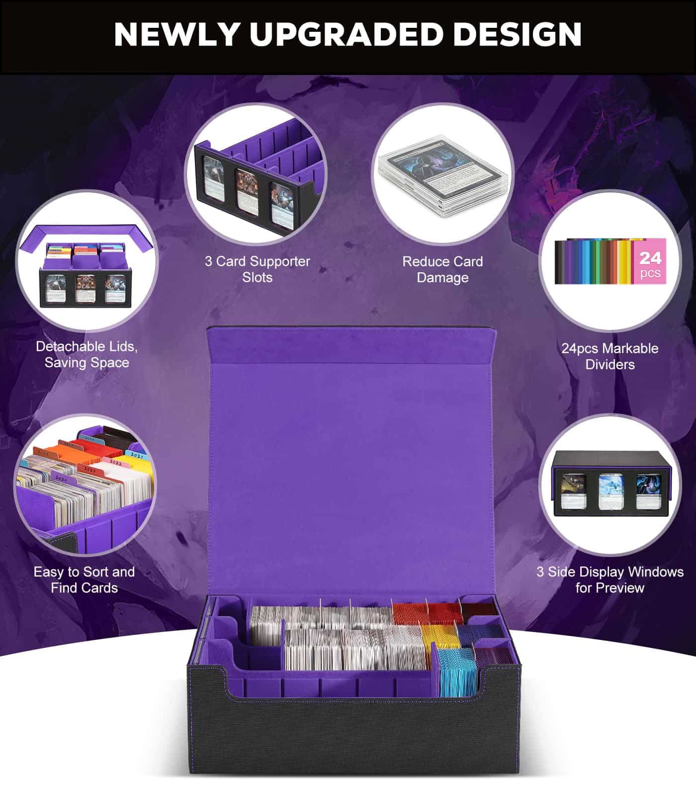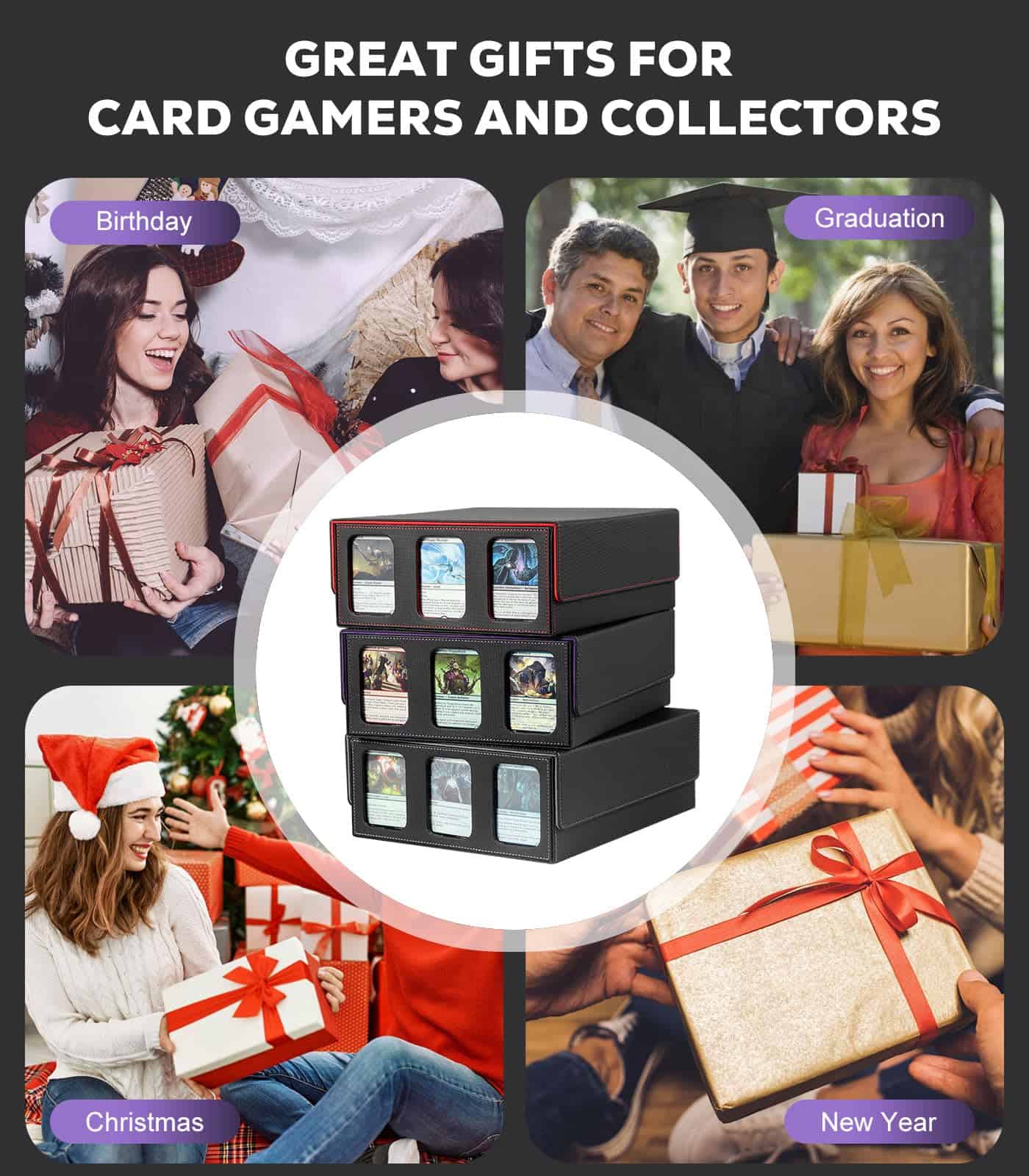 Nuestra caja de cartas comerciales es lo suficientemente grande como para almacenar más de 2300 cartas sin funda, más de 1300 cartas con funda única y más de 1000 cartas con funda doble. Es un regalo perfecto para enviar a tus amigos que aman coleccionar cartas.
