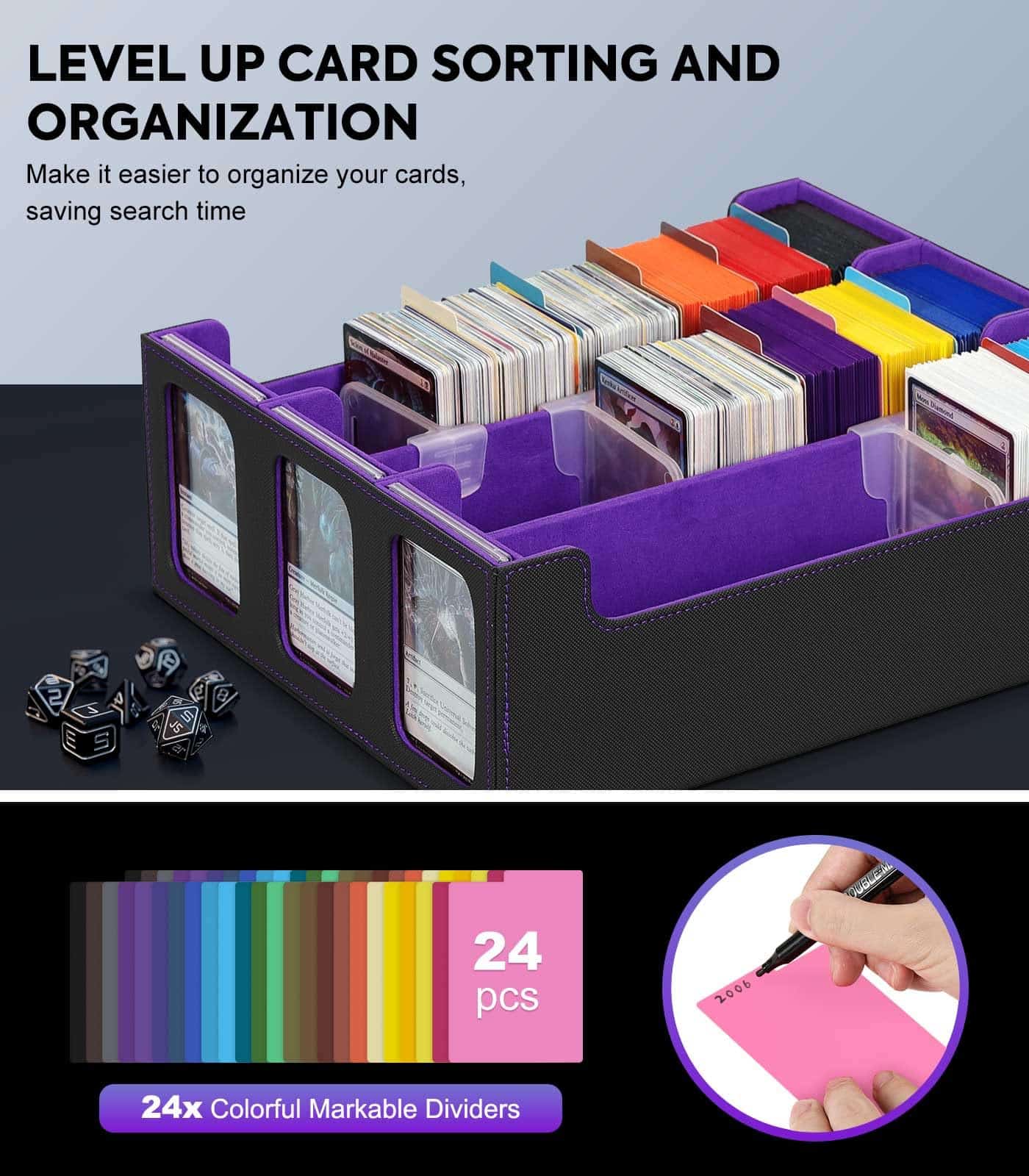 Viene con 24 pestañas de separadores de color para ayudarte a separar diferentes tipos de cartas de juego, lo que hace que sea más fácil organizarlas y clasificarlas.