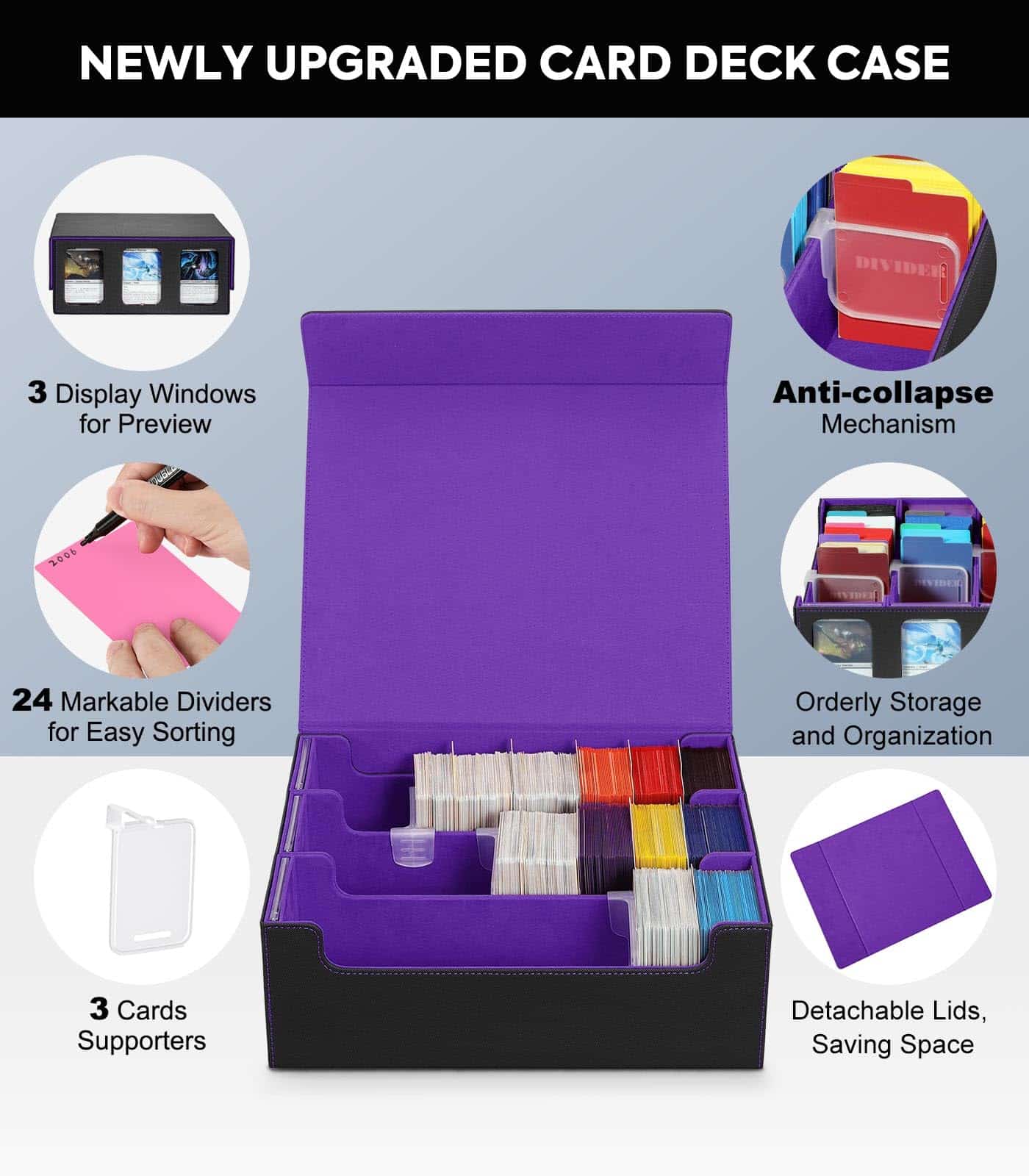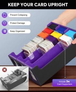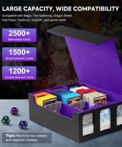 Nuestra caja de almacenamiento de cartas es lo suficientemente grande como para almacenar 2500+ cartas sin funda, 1500+ cartas con una sola funda, y 1200+ cartas con doble funda. Es un regalo perfecto para enviar a tus amigos que aman coleccionar cartas.