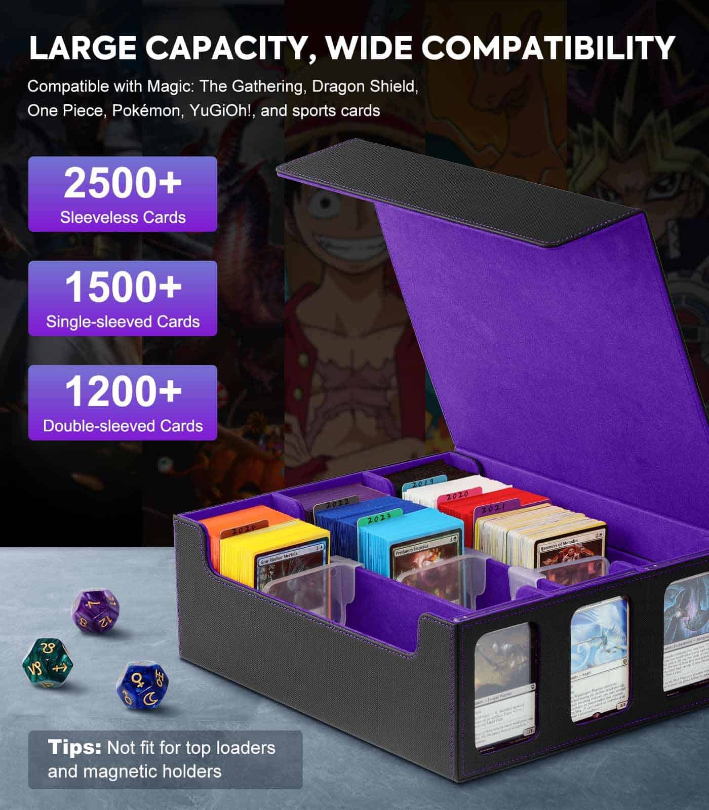 Nuestra caja de almacenamiento de cartas de tcg es perfectamente compatible con Magic: The Gathering, Dragon Shield, One Piece, Pokémon, YuGiOh!, Duel Masters, y cartas de deportes como las de fútbol, baloncesto y béisbol en fundas de centavo, así como cartas Dominion y expansiones, y más coleccionables.