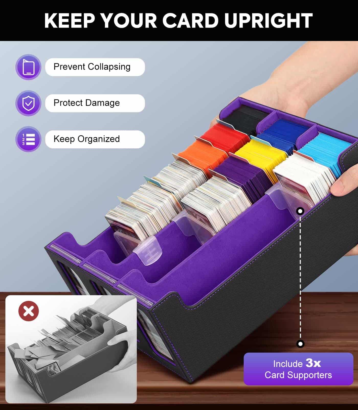 Diseñados para evitar que tus cartas valiosas se colapsen. Incluso cuando la caja de almacenamiento de cartas no está completamente llena, estos soportes de estilo ranura aseguran que tus cartas se mantengan en posición vertical, evitando daños y un efecto dominó de derribo.
