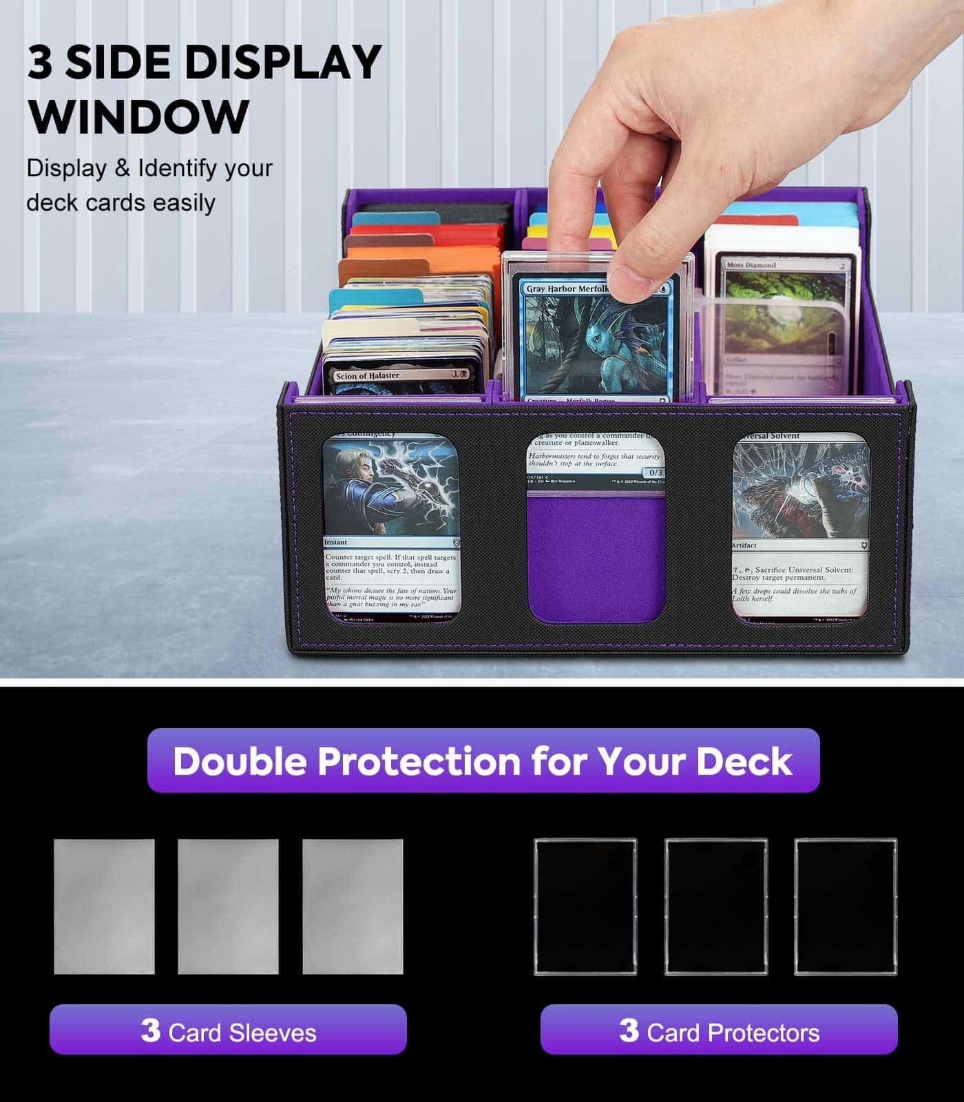 Esta caja de mazo de cartas cuenta con ranuras en un lado para mostrar 3 cartas, lo que te permite diferenciar fácilmente entre cajas y previsualizar su contenido.