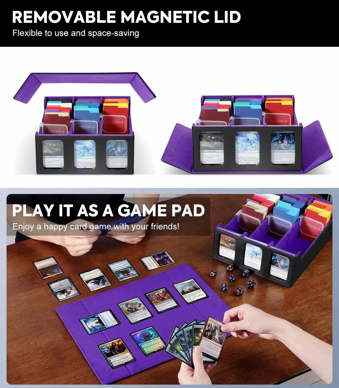 Nuestra caja de almacenamiento de mtg tiene un diseño de cierre magnético, y la fuerte succión del imán puede mantener la caja cerrada muy bien.