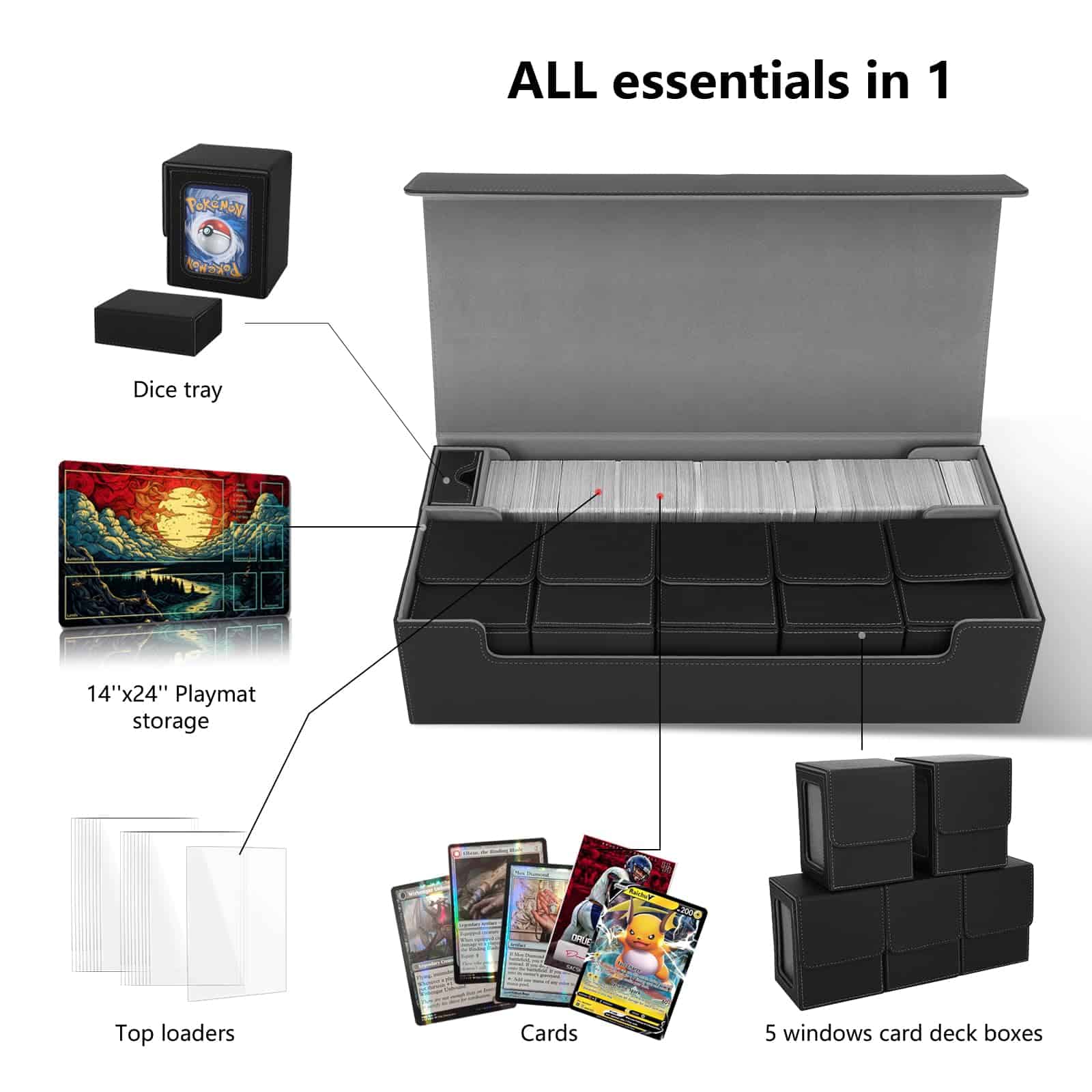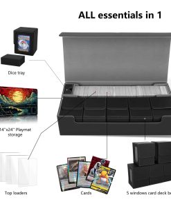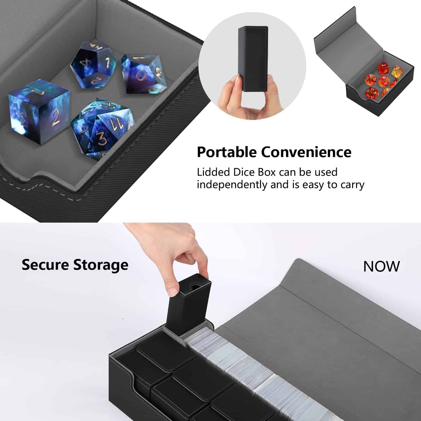 1. Práctico para transportar varios mazos – Esta caja de mazo TCG aloja exactamente 5 cajas de cartas pequeñas con ventanas de visualización (no incluidas, se venden por separado), ideal para almacenar 5 mazos de comandante. Cuenta con una caja de dados mejorada con tapa para almacenar dados, contadores de daño, marcadores de veneno/quemado y fichas adicionales. También incluye un compartimento de almacenamiento de tapetes para sostener tapetes de juego o hasta 800+ cartas enfundadas individuales. Mantén todas tus esenciales juntas en una sola caja de cartas.
