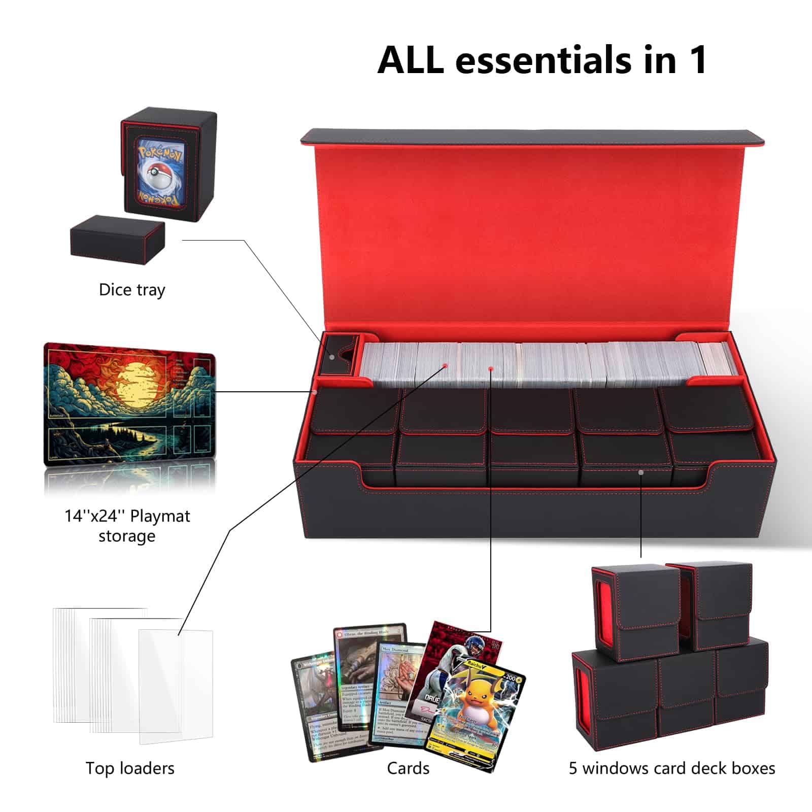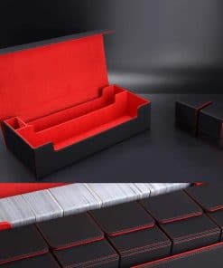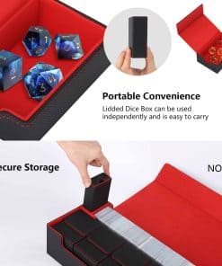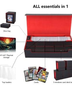 1. Conveniente para transportar varios mazos – Esta Caja de Mazo TCG aloja precisamente 5 cajas de cartas pequeñas con ventanas de visualización (no incluidas, se venden por separado), ideal para almacenar 5 mazos de comandante. Incluye un estuche de dados mejorado con tapa para guardar dados, contadores de daño, contadores de veneno/quemadura y fichas adicionales. También incluye un compartimento de almacenamiento de tapete para sostener tapetes de juego o hasta 800+ cartas enfundadas individuales. Mantenga todos sus elementos esenciales juntos en una caja de cartas.
