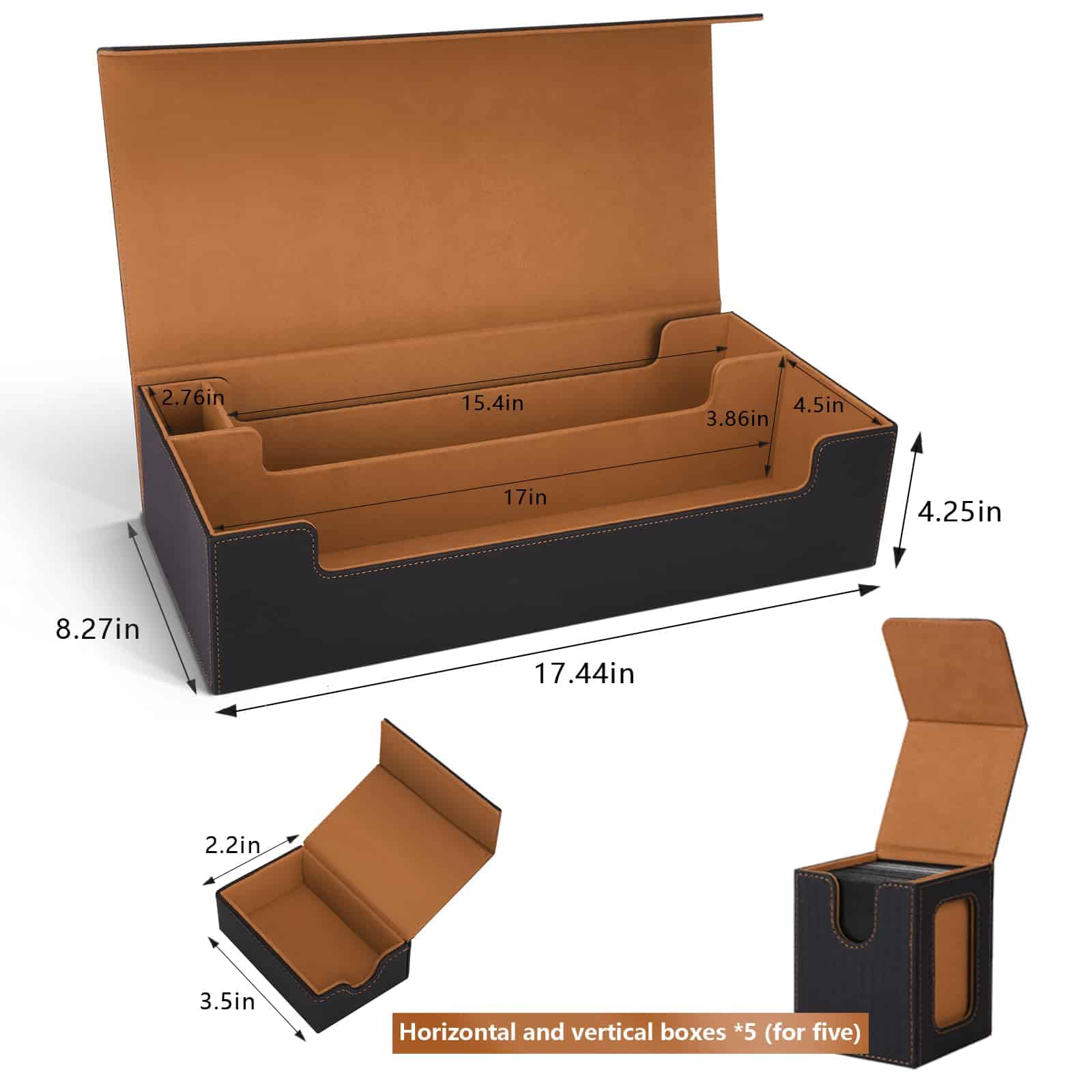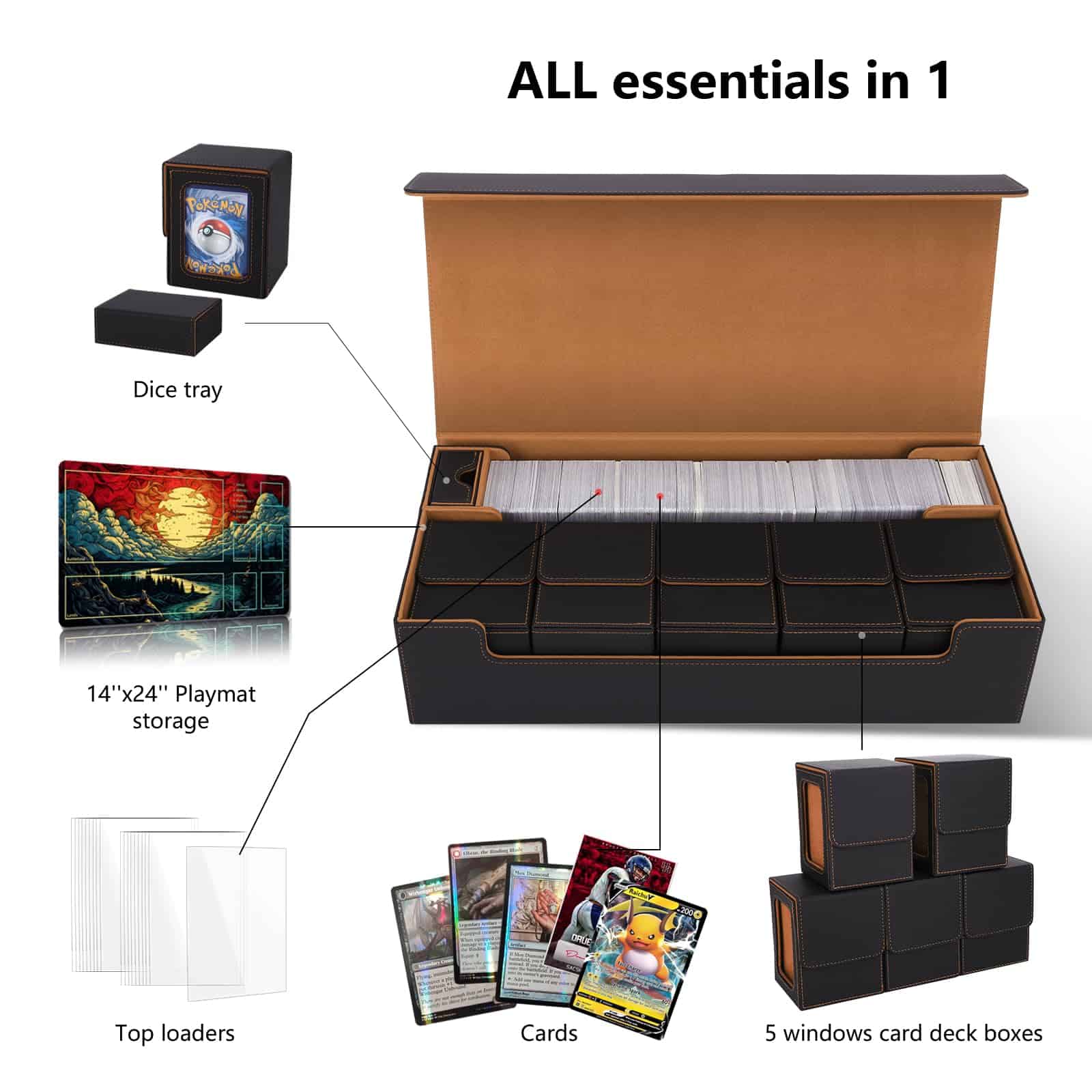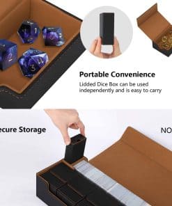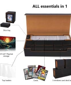 1. Conveniente para llevar múltiples mazos – Esta caja de mazos TCG se adapta exactamente a 5 cajas pequeñas de cartas con ventanas de visualización (no incluidas, se venden por separado), ideal para almacenar 5 mazos de comandante. Cuenta con una caja de dados mejorada con tapa para almacenar dados, contadores de daño, marcadores de veneno/quemadura y fichas adicionales. También incluye un compartimento de almacenamiento de tapetes para sostener tapetes de juego o hasta 800+ con fundas individuales. Mantén todos tus elementos esenciales juntos en una caja de cartas.