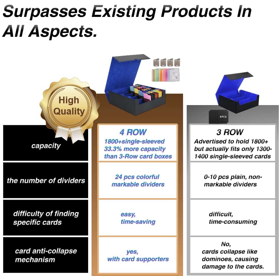 1. Capacidad Ultra para Mazo de Cartas Cambiar de una caja de mazo de cartas estándar de 3 hileras a una de 4 hileras aumenta la capacidad en un 33.3%. Esta caja de mazo TCG se ajusta cómodamente a más de 3000 cartas sin funda, más de 1800 cartas con una sola funda o más de 1500 cartas con doble funda, excluyendo cargadores superiores y soportes magnéticos.