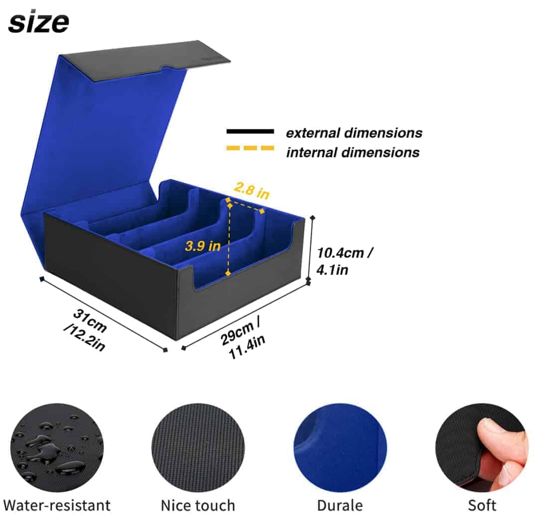 5. Elementos Esenciales del Coleccionista o Regalo Con una resistente carcasa de cuero PU para protección contra golpes y un suave interior de microfibra para salvaguardar las cartas contra arañazos, esta gran caja de cartas de trading incluye varios imanes para un cierre seguro, garantizando un transporte seguro. ¡Es una excelente elección para jugadores de cartas!