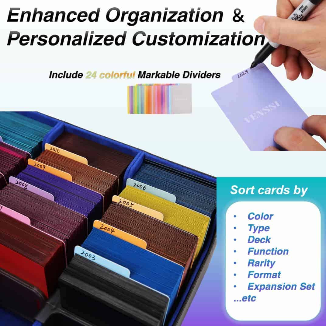3. Separadores Coloridos para una Organización Sencilla Esta caja de almacenamiento de cartas está equipada con 24 separadores coloridos que se pueden etiquetar, lo que facilita la organización y categorización de cartas y accesorios. Esta configuración permite una rápida identificación y recuperación de cartas, ahorrando tiempo de búsqueda y mejorando la eficiencia.