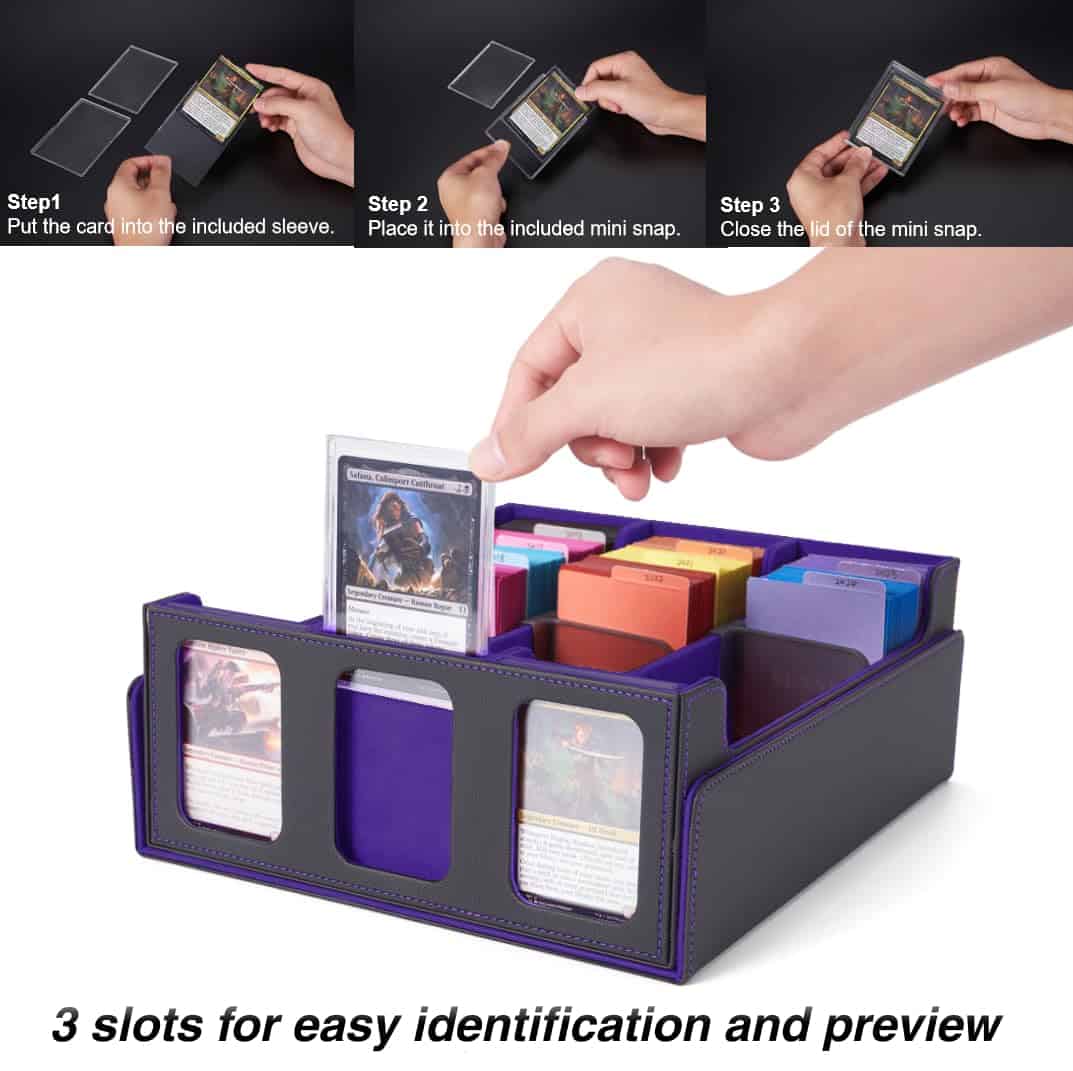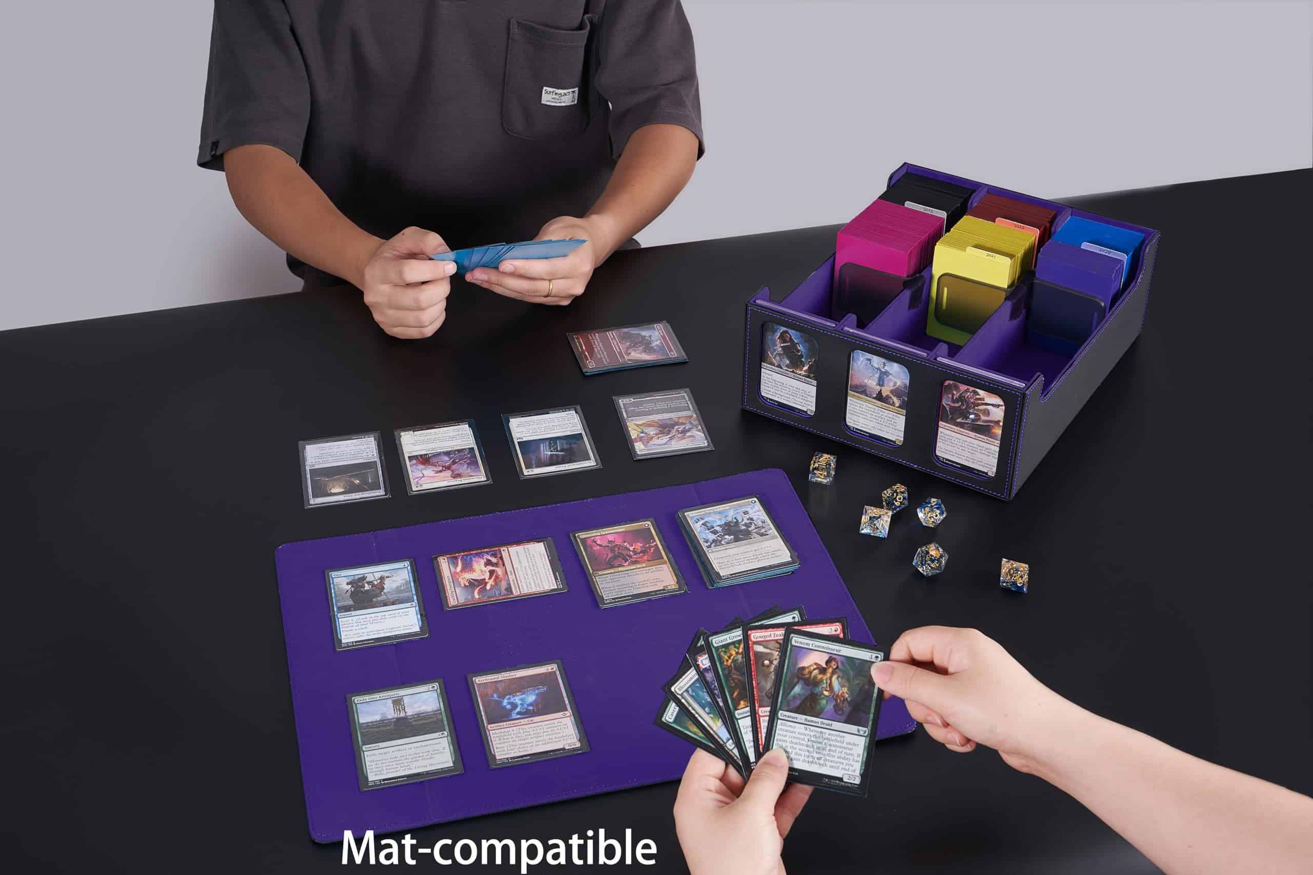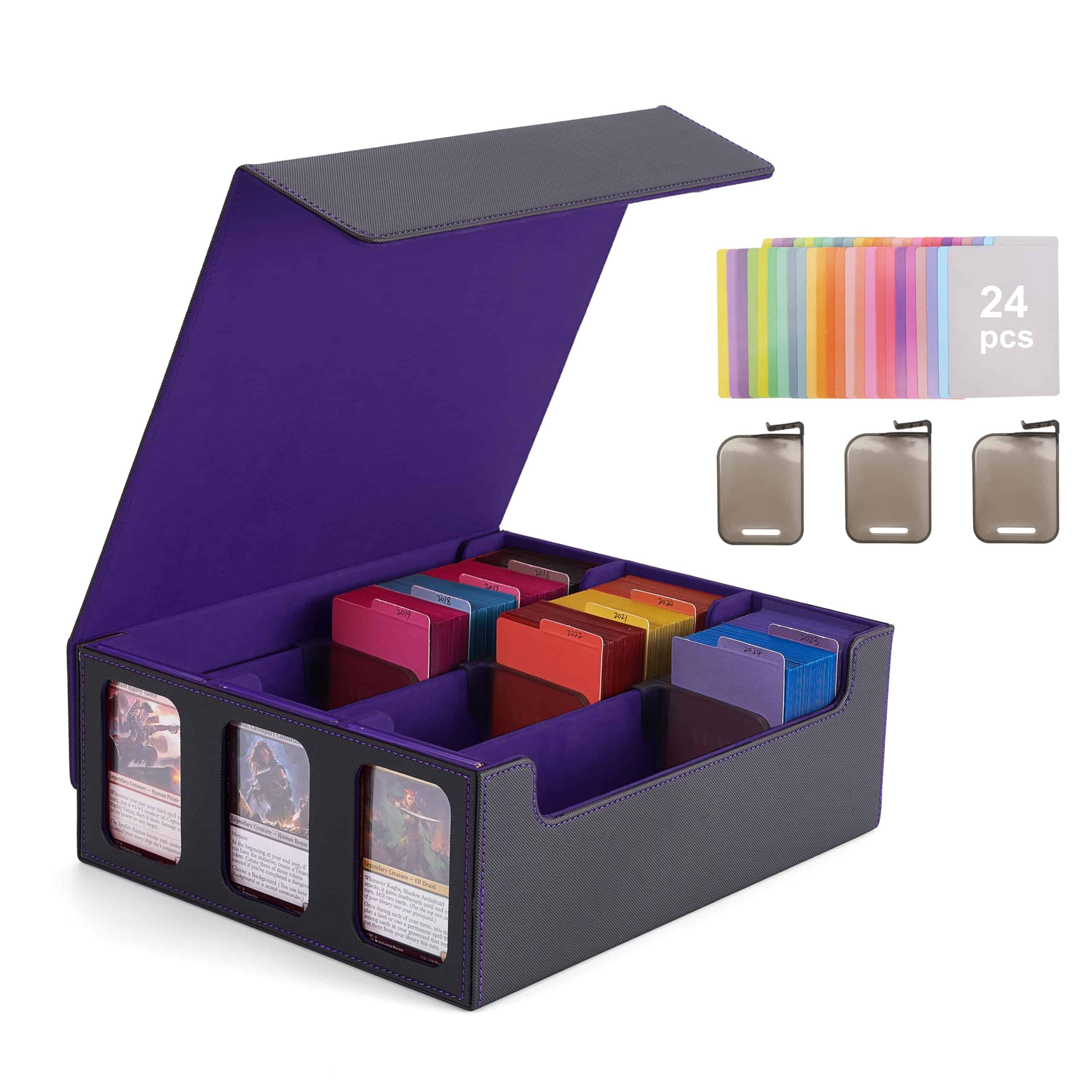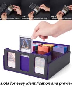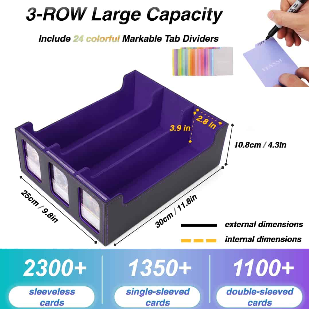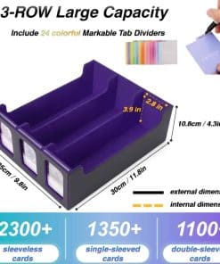 1. Caja de Cubiertas de Alta Capacidad Este estuche de cubiertas TCG de 3 filas se adapta cómodamente a 2300+ cartas sin fundas, 1350+ cartas con una sola funda, o 1100+ cartas con doble funda, excluyendo las cargadores superiores y los soportes magnéticos.