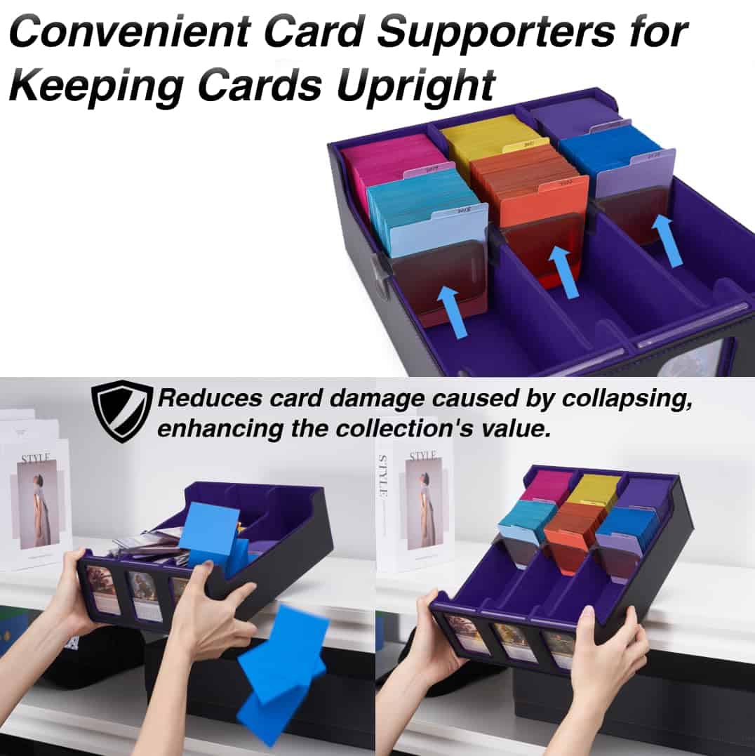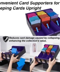 2. Soportes de Cartas Innovadores Diseñados para evitar que tus cartas valiosas se derrumben. Incluso cuando la caja de almacenamiento de cartas no está completamente llena, estos separadores de soporte de estilo de clip aseguran que tus cartas permanezcan en posición vertical, evitando daños y caídas tipo dominó. Esta característica no solo preserva la condición de tus cartas, sino que también mejora el valor coleccionable de tu creciente colección al mantenerlas en un estado impecable.