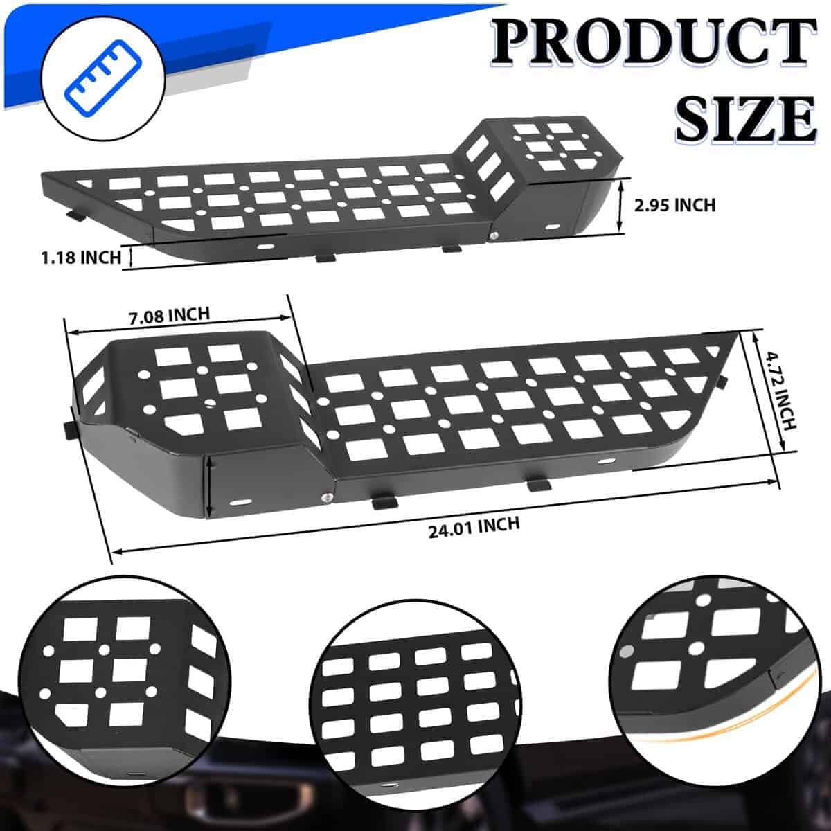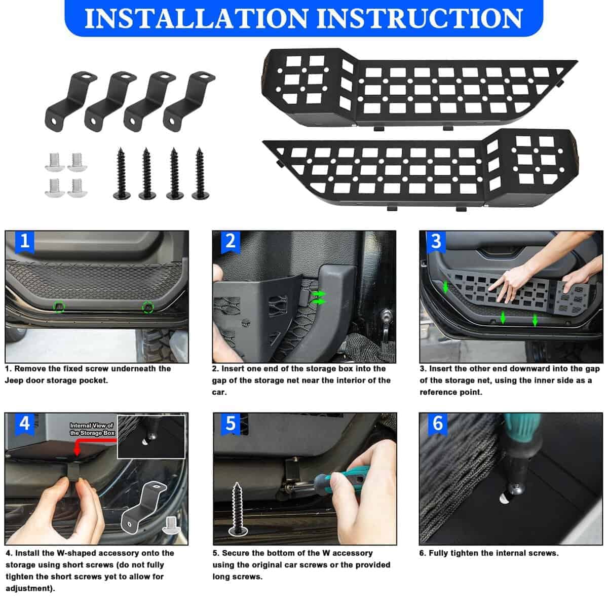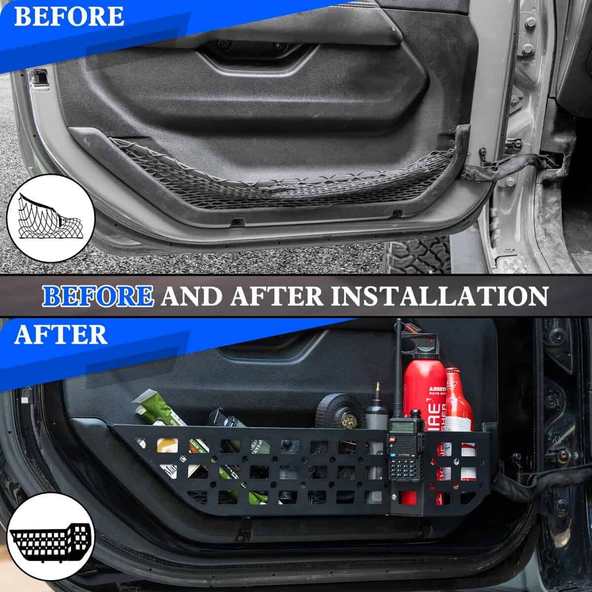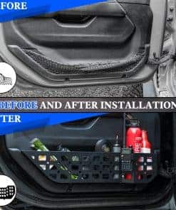 Upgradation Your Wrangler Doors Reemplace la red de la puerta caída, nuestros bolsillos del panel Molle de la puerta delantera compatibles con Jeep Wrangler JL JLU 2018 2019 2020 2021 2022 2023 2024, Gladiator JT 2020 2021 2022 2023 2024, 4XE, Rubicon, Sport, Sahara, Moab 2/4 puerta Tenga en cuenta: No apto para modelos JK/JKU o Asientos eléctricos. No se requiere perforación Nuestra caja de almacenamiento integrada para paneles Molle es fácil de instalar. A diferencia del método de instalación «Snap in», que puede ser inestable y propenso a roturas, nuestro método de instalación por tornillo garantiza un ajuste seguro y estable para su automóvil, incluso en terrenos difíciles. Maximice el espacio de almacenamiento Mantenga su automóvil limpio y organizado con nuestros amplios bolsillos de almacenamiento. Guarde elementos esenciales como toallas de papel, agua embotellada, teléfonos celulares, gafas de sol, cremas de manos, billeteras, llaves y más. Nuestra solución de almacenamiento amplía sus opciones de almacenamiento, lo que le permite disfrutar de un viaje cómodo y libre de desorden. Construcción de calidad premium Nuestra caja de almacenamiento se ha actualizado con material de acero inoxidable 304 de alta calidad, garantizando una durabilidad superior y resistencia a la deformación. Experimente la tranquilidad sabiendo que nuestro producto está diseñado para durar y proporcionar una solución confiable de almacenamiento para su Wrangler. Servicio posventa Si, por cualquier razón, no está completamente satisfecho con el almacenamiento de puerta Molle de Z8, comuníquese con nosotros dentro de los 30 días. Nos comprometemos a resolver cualquier problema y garantizar una experiencia de compra agradable para usted. Además, nuestro producto está respaldado por una garantía de 24 meses.
