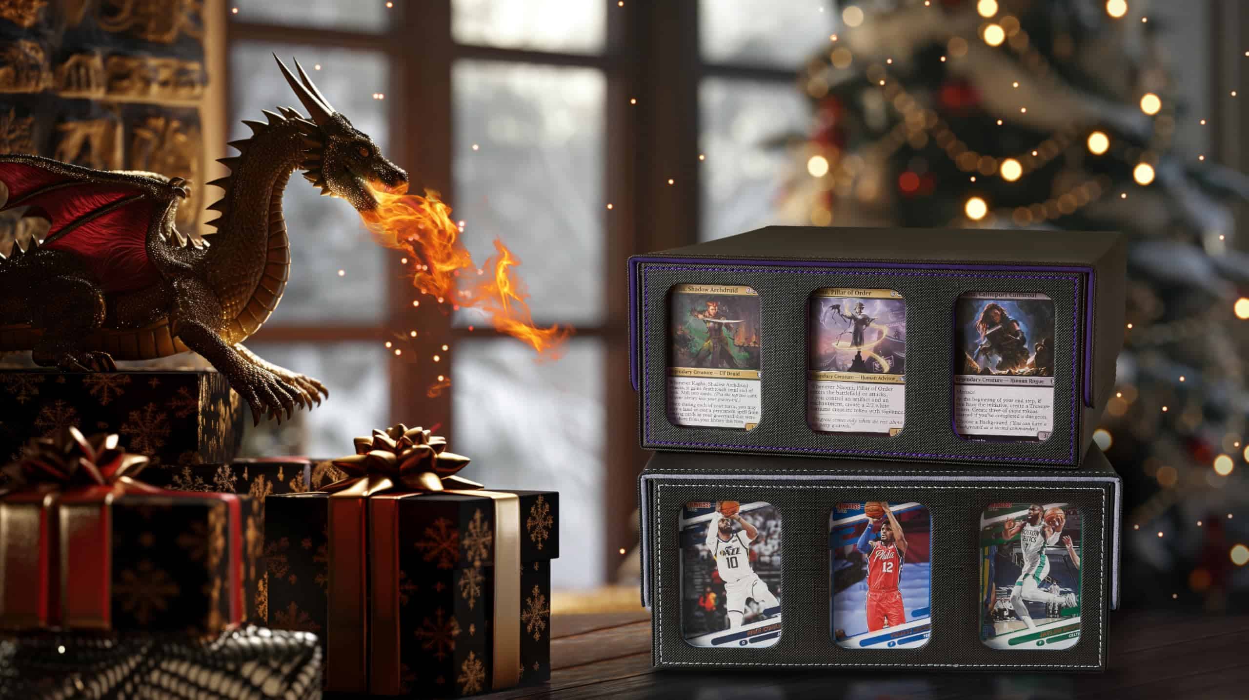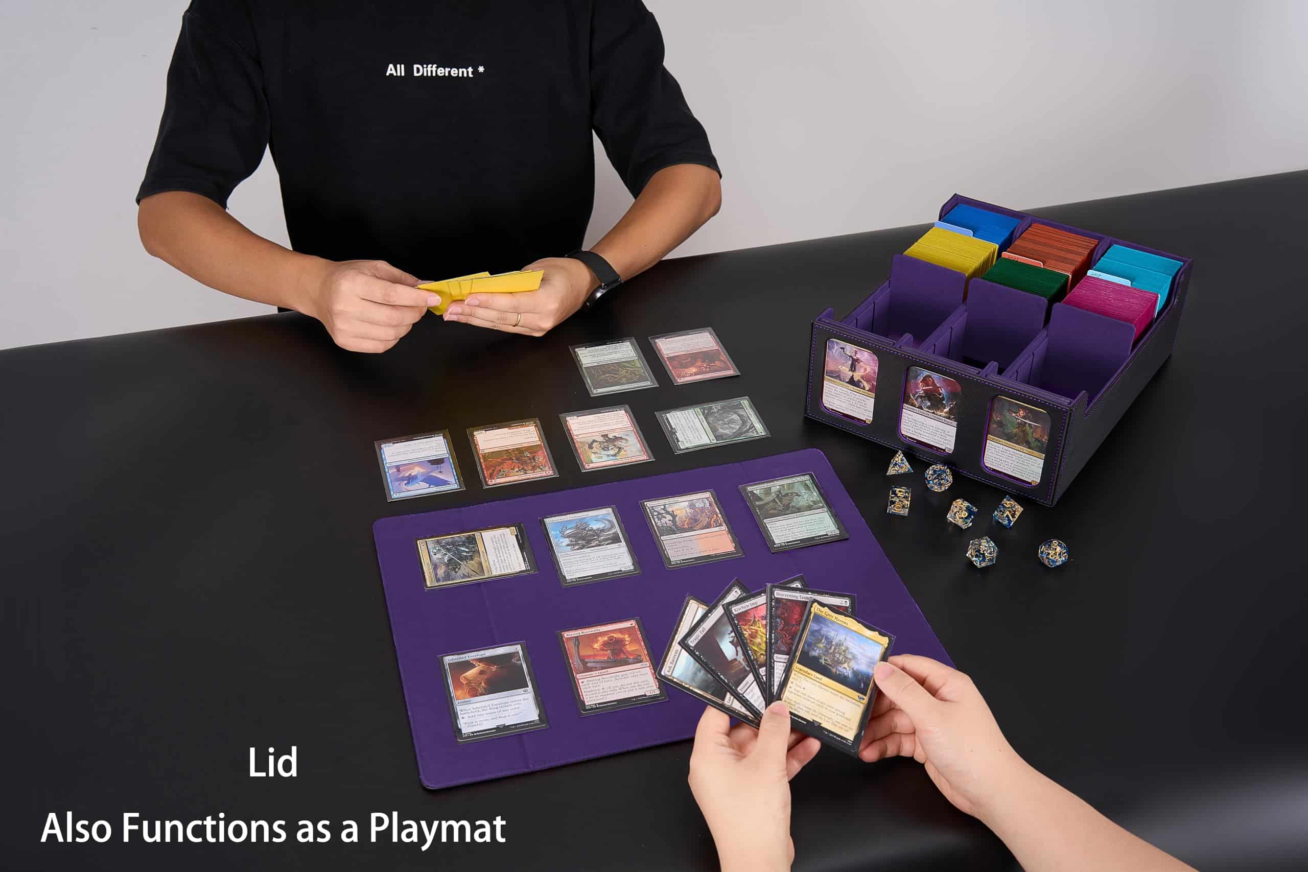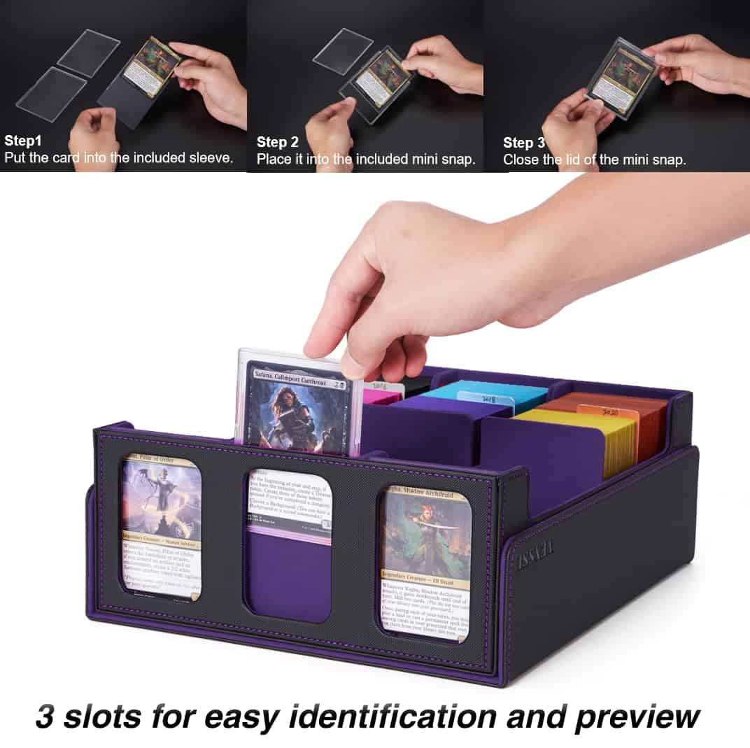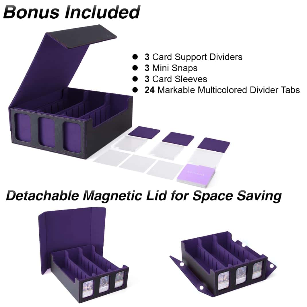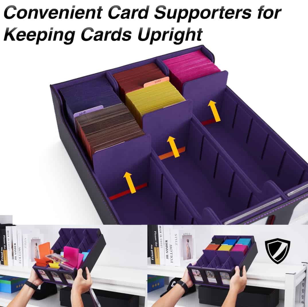 Caja de Almacenamiento de Tarjetas Venssu para Cartas Coleccionables con Soportes para Tarjetas, Caja de Mazo MTG de 2300+ con 24 Separadores Coloridos, Almacenamiento de Cartas con Ventanas de Visualización, para Juego de Magia (Negro y Morado). Cambiar de una caja de mazo estándar de 3 filas a una de 4 filas aumenta la capacidad en un 33.3%. Esta caja de mazo TCG se adapta cómodamente a más de 3000 cartas sin proteger, más de 1800 cartas protegidas con una sola funda, o más de 1500 cartas protegidas con doble funda, excluyendo protectores superiores y soportes magnéticos. Diseñados para evitar que tus valiosas tarjetas se colapsen. Incluso cuando la caja de almacenamiento de cartas no está completamente llena, estos soportes de estilo ranura aseguran que tus tarjetas se mantengan en posición vertical, evitando daños y caídas en forma de dominó. Esta característica no solo preserva la condición de tus tarjetas, sino que también eleva el valor coleccionable de tu creciente colección al mantenerlas en forma impecable. Esta caja de almacenamiento de cartas está equipada con 24 pestañas divisoras marcables y multicolores que se pueden etiquetar, lo que facilita la organización y categorización de cartas y accesorios. Esta configuración permite una identificación y recuperación rápida de las cartas, ahorrando tiempo de búsqueda y mejorando la eficiencia. Esta caja de almacenamiento cuenta con ranuras en un lado para mostrar 4 cartas, lo que te permite diferenciar fácilmente entre cajas y previsualizar su contenido. Viene con mini broches y fundas para cada carta. Diseñada para jugadores y coleccionistas, nuestras cajas de mazo de cartas son perfectas para una variedad de cartas de juego y coleccionables, incluyendo Magic: The Gathering, Dragon Shield, One Piece, Pokémon, YuGiOh!, Duel Masters, cartas deportivas y cartas Dominion con expansiones. Con una resistente carcasa de cuero PU para protección contra impactos, un suave interior de microfibra para evitar arañazos, y múltiples imanes para un cierre seguro, esta gran caja de cartas de juego asegura un transporte y organización seguros, convirtiéndola en la mejor opción para jugadores de cartas!