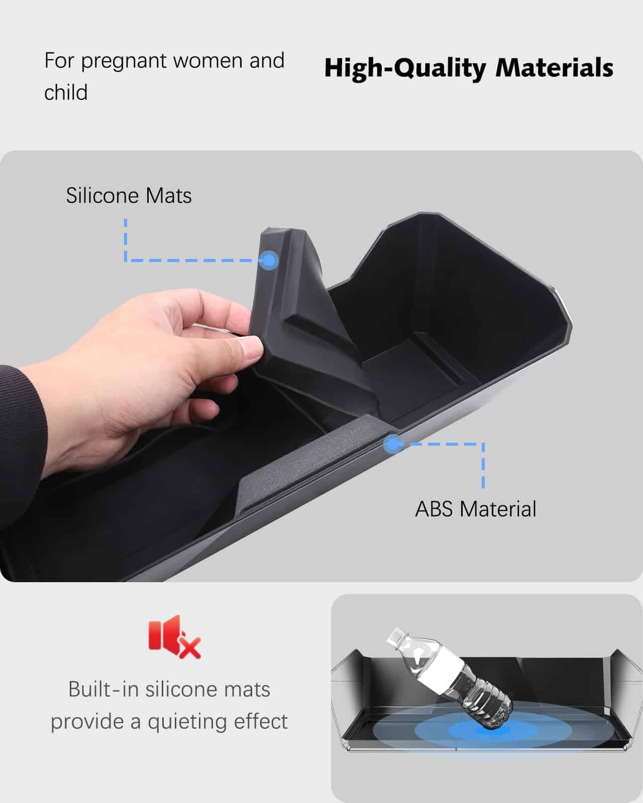 3. Material de ABS y silicona: Esta caja de almacenamiento de cybertruck está hecha de plástico ABS que es fuerte y ligero. La alfombrilla interior de silicona proporciona un acolchado adicional y protección para los artículos almacenados.