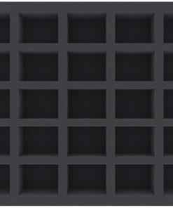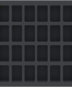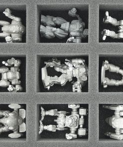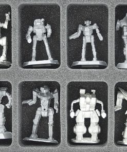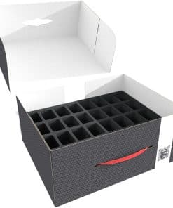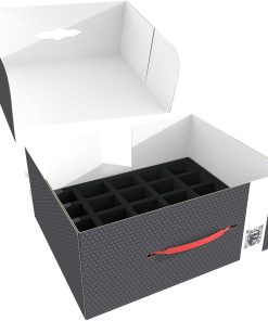 ¡Es hora de pelear! – Pero no sin nuestra Caja de Almacenamiento M con las bandejas de espuma a juego para tus Mechs. El set contiene: 1 Caja de Almacenamiento FSLB150, 2 bandejas de espuma de medio tamaño con 10 compartimentos cada una para Mechs grandes (HSBE050BO), 1 bandeja de espuma de tamaño completo con 32 compartimentos para Mechs (FSMEDS040BO), 1 bandeja de espuma de tamaño completo con 25 compartimentos para Mechs (FSLQ050BO), 1 topper de espuma. Las 2 bandejas de espuma con 10 compartimentos cada una son ideales para Mechs grandes y pueden contener hasta 4 lances con accesorios. Las dimensiones de los 10 compartimentos de cada una de las 2 bandejas son: 2 compartimentos: 70 mm de largo x 52 mm de ancho x 40 mm de profundidad, 8 compartimentos: 70 mm de largo x 42 mm de ancho x 40 mm de profundidad. La bandeja de espuma con 32 compartimentos puede contener hasta 8 lances. Cada uno de los 32 compartimentos mide 54 mm de largo x 35 mm de ancho x 30 mm de profundidad. Los Mechs ligeramente más grandes en bases de hasta 40 mm pueden almacenarse en la bandeja de espuma con 25 compartimentos: Cada uno de los 25 compartimentos mide 54 mm de largo x 41 mm de ancho x 40 mm de profundidad. Por supuesto, la espuma de poros finos ofrece la mejor protección posible para tus máquinas de combate. Las partes delicadas quedan intactas, el color de los modelos pintados no se rayará. El set se completa con el topper de espuma a juego. El topper se coloca encima de las bandejas de espuma y se asegura de que nada pueda caerse incluso durante el transporte. Las bandejas de espuma encajan perfectamente en la Caja de Almacenamiento M. La caja – hecha de cartón doble recubierto – no solo es ligera sino también particularmente estable. Con el asa de plástico se puede transportar fácilmente. Dimensiones de la Caja de Almacenamiento: dimensiones internas: 345 mm x 275 mm x 150 mm las dimensiones externas son ligeramente más grandes espuma de poros finos – Hecha en Alemania libre de cloro y ácido