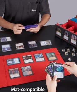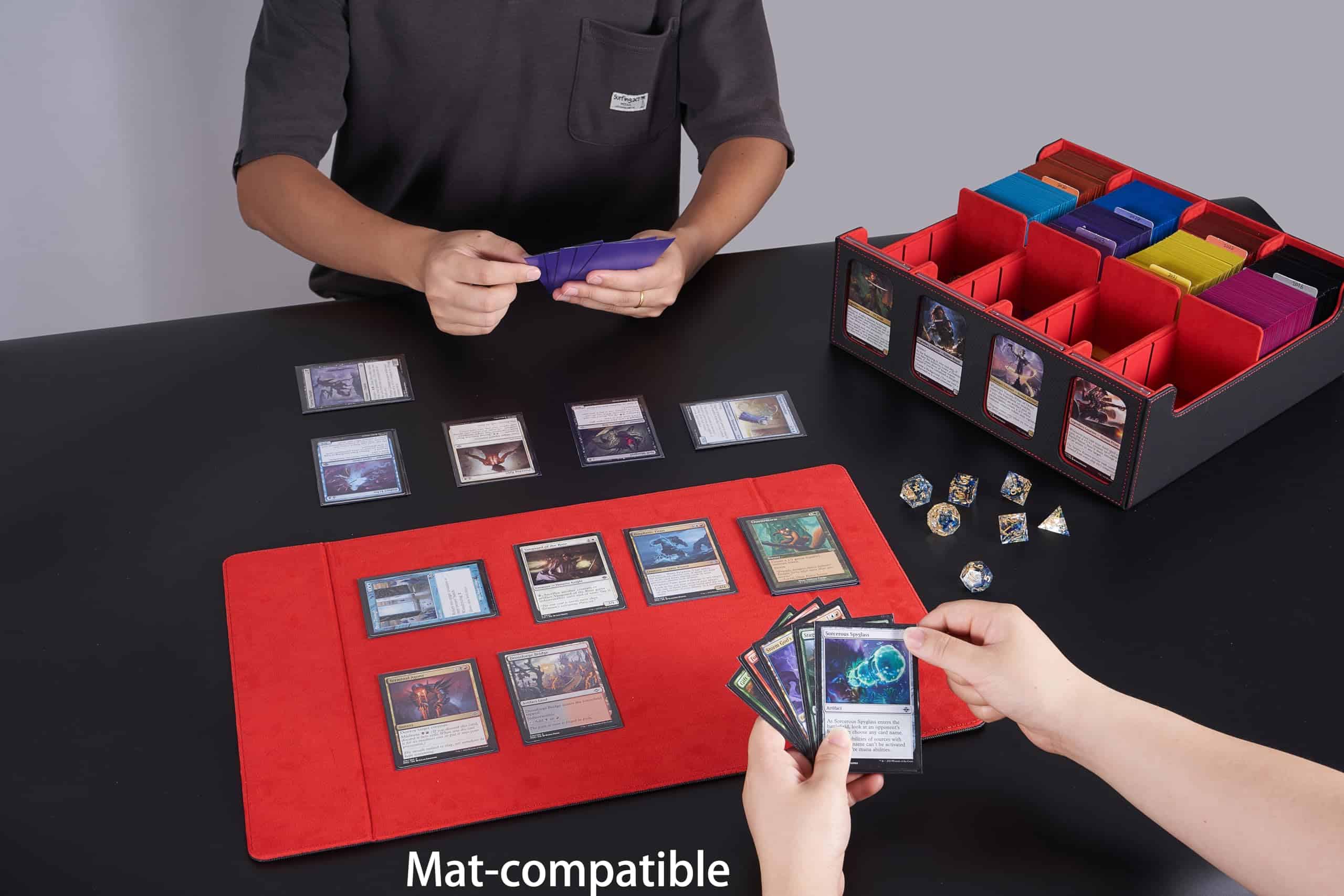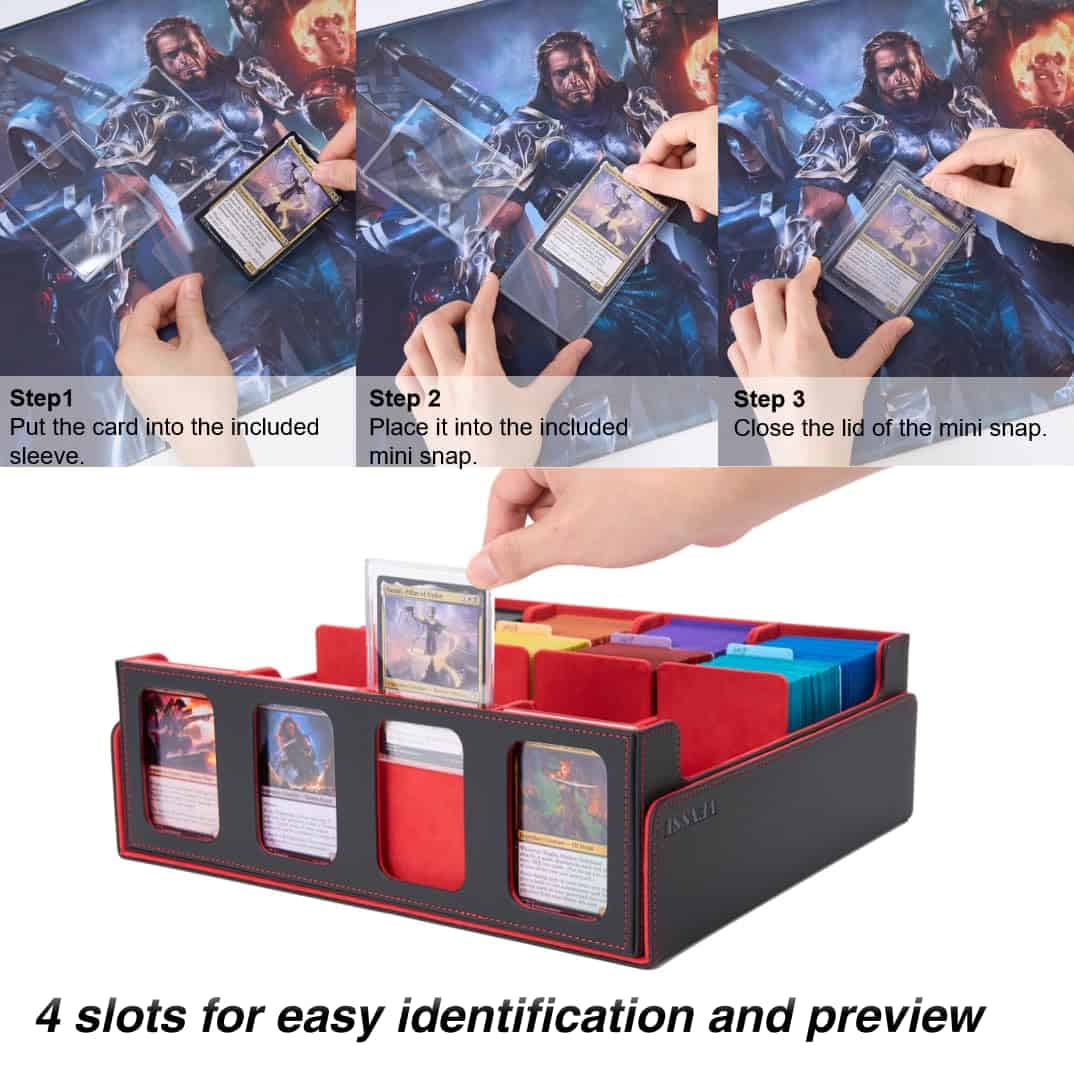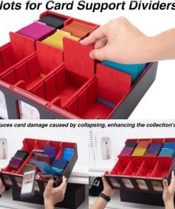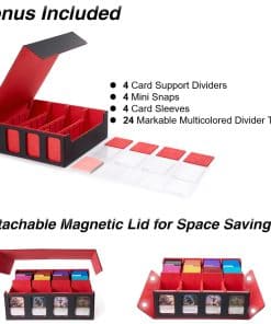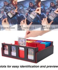 Caja de almacenamiento Venssu para cartas coleccionables con soportes de cartas, capacidad ultra de mazo de cartas, 3000+ cartas MTG con 24 pestañas divisoria de colores, almacenamiento de cartas coleccionables con ventanas de visualización se adapta al juego de Magic: The Gathering (Negro y Rojo). Cambiar de 3 a 4 filas aumenta la capacidad de la caja de mazo de cartas en un 33,3%. Esta caja TCG se adapta cómodamente a 3000+ cartas sin funda, 1800+ cartas con una sola funda, o 1500+ cartas con doble funda. Los soportes de cartas estilo ranura evitan que las cartas se colapsen y se mantengan erguidas, preservando su condición. Viene con 24 separadores marcables de colores para una organización simple. Las ranuras de visualización permiten previsualizar 4 cartas para una fácil identificación. Perfecto para una variedad de cartas de juego y coleccionables. Con carcasa de cuero PU resistente, interior de microfibra suave y cierre magnético seguro para un transporte seguro y organización eficiente.