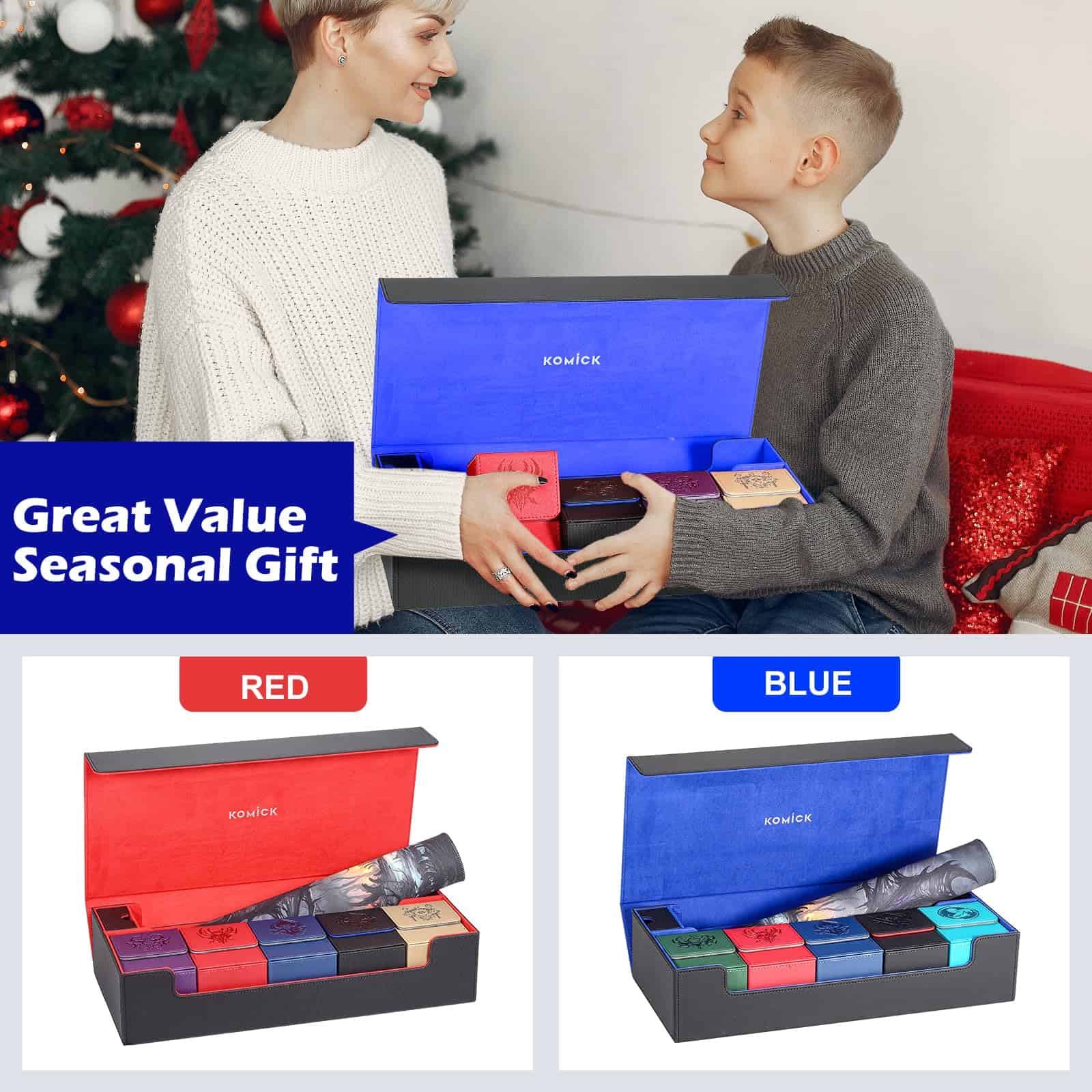 Eleva tu experiencia de juego de cartas con el Juego de Cajas de Cartas Ultimate 6 en 1, diseñado para jugadores de Yugioh, MTG y varios juegos de cartas de intercambio. Este set versátil incluye una caja de almacenamiento grande con 5 cajas de cartas más pequeñas con patrones de dragón y una bandeja de dados dedicada. Organiza hasta 2400+ cartas sin fundas o 1200+ cartas con una sola funda en la caja grande, mientras que las cajas más pequeñas pueden contener 80+ cartas con doble funda o 100+ cartas con una sola funda cada una, asegurando que todas tus cartas estén almacenadas de forma segura. Fabricado con cuero de poliuretano duradero, este set de cajas de cartas ofrece protección impermeable y una textura interior suave para proteger tus cartas durante el transporte. El diseño innovador incorpora espacio para tu tapete, lo que hace conveniente almacenar y transportar tu tapete junto con tu baraja. Con un sistema de cierre magnético, tus cartas se mantienen seguras y protegidas, incluso durante caídas accidentales. Experimenta la conveniencia de tener todo lo que necesitas para tus juegos de cartas en un solo lugar, desde almacenamiento seguro hasta un área de juego designada. Mejora tu experiencia de juego, protege tus cartas y sumérgete en el mundo de los juegos de cartas de intercambio como nunca antes con este meticulosamente elaborado Juego de Cajas de Cartas Premium. Lleva tus noches de juego al siguiente nivel con la Caja de Cartas Komick 6 en 1, un regalo perfecto para los entusiastas de los juegos de cartas de intercambio que buscan practicidad y estilo.