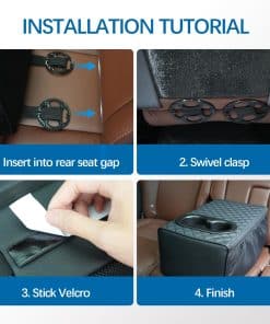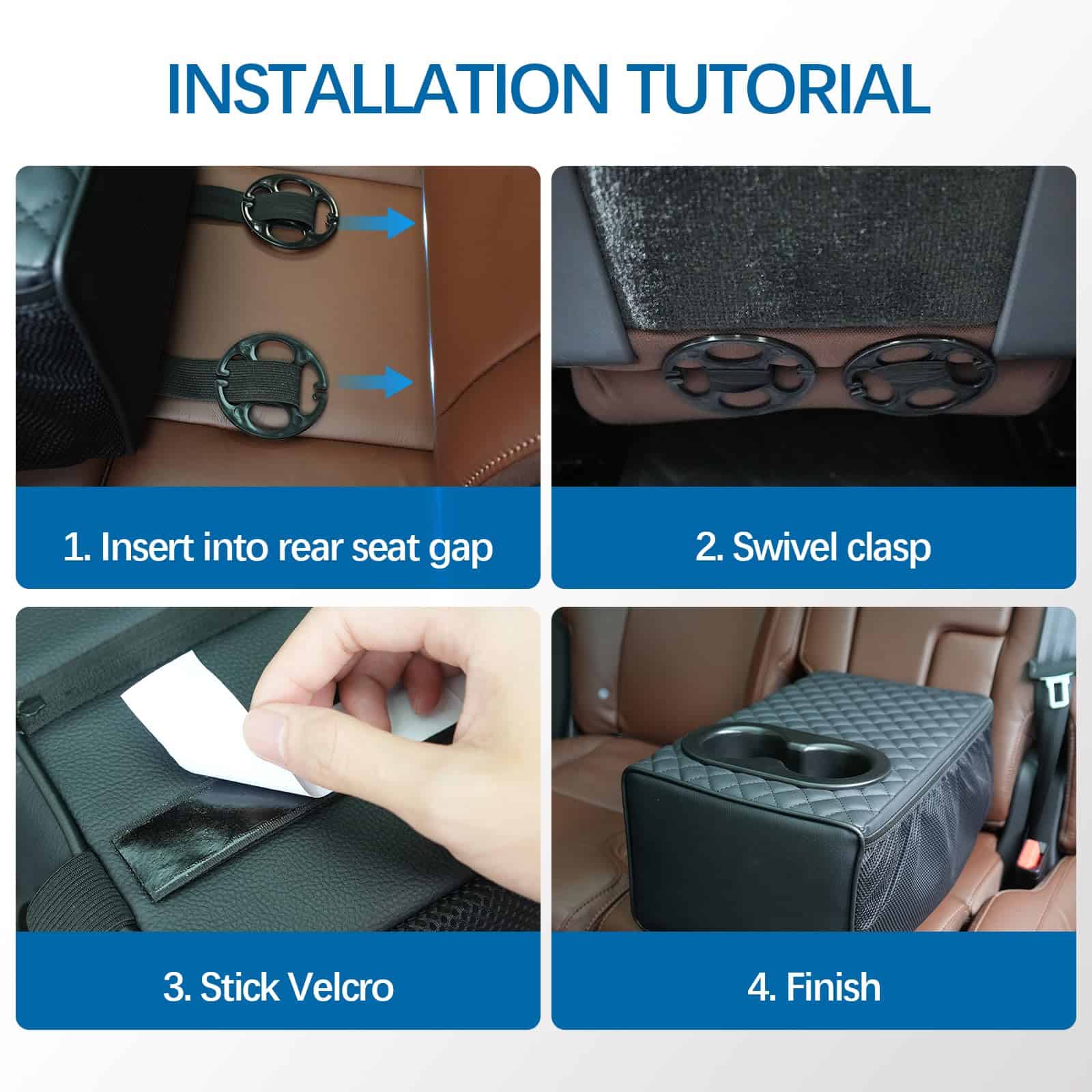 3. Dos métodos de fijación Sin necesidad de herramientas, se puede fijar firmemente a los asientos de la segunda fila. La caja de reposabrazos central tiene dos cintas adhesivas específicas para automóviles adheridas en la parte inferior de los asientos, que no dañarán la superficie de los asientos del automóvil. Además, dos hebillas se fijan al asiento trasero para garantizar que la caja de reposabrazos central no se mueva.