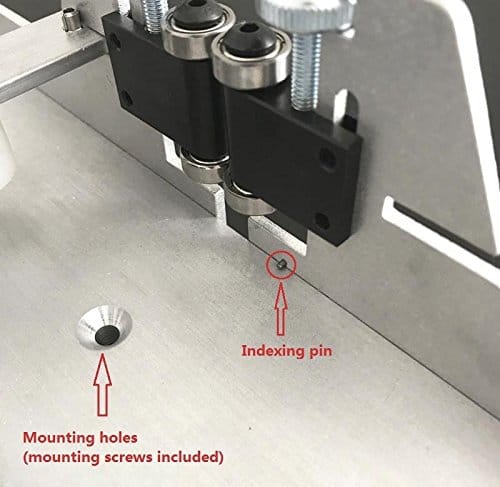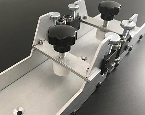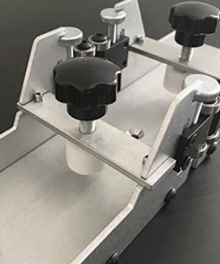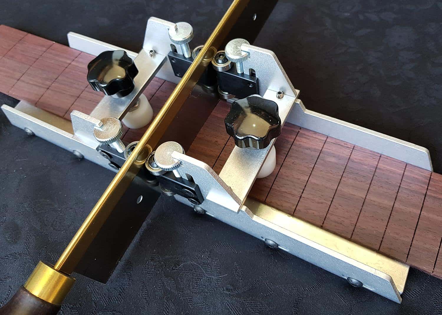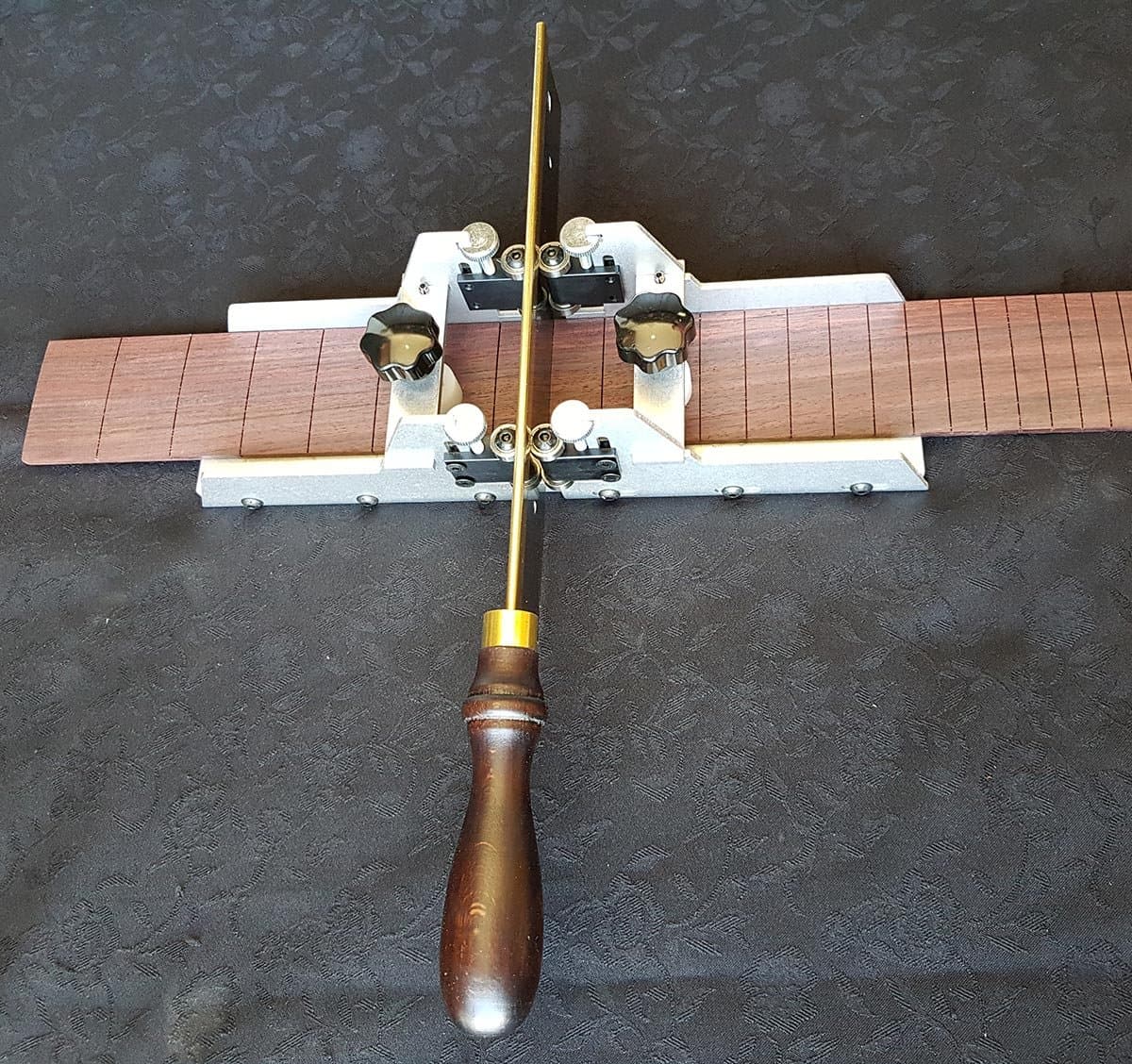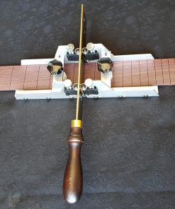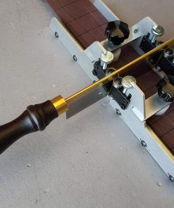 Juego de Caja de Inglete y Sierra para Cortar Trastes – Guías de rodamiento de bolas suaves – Hecho de aluminio resistente – Extremadamente preciso – Incluye nuestra sierra de corte de trastes – Se ajusta para adaptarse perfectamente a la hoja de sierra – Ajuste preciso de profundidad – Acomoda diapasones de hasta 1/2″ (12mm) de grosor y 3″ (76mm) de ancho – 12″ (305mm) de largo – Perforado previamente para montaje en banco de trabajo – Tornillos de montaje y llaves Allen incluidas Nuestra Caja de Inglete para Cortar Trastes le permite cortar trastes con precisión con una sierra de corte de trastes. Las guías de rodamiento de bolas hacen que el serrado sea más fácil y rápido al mantener la sierra de trastes perpendicular al diapasón. Las guías se pueden ajustar para que coincidan precisamente con la hoja de sierra. Puede ranurar rápidamente cualquier tabla de hasta 3″ (76mm) de ancho. La profundidad del corte es ajustable y se puede adaptar a cualquier alambre de trastes. El diseño de la caja de inglete le permite ver fácilmente el diapasón mientras lo está ranurando y alinear la sierra donde necesita cortar. Dos abrazaderas integradas se pueden apretar para sostener rápidamente y firmemente el diapasón en su lugar mientras se corta cada ranura de trastes. Hecho de aluminio resistente, la caja de inglete tiene orificios de montaje convenientes para una sujeción firme a su banco de trabajo, los tornillos de montaje y ajustadores de llaves Allen están incluidos. Nota: La caja de inglete no funcionará para cuellos de guitarra tradicionales de estilo Fender de una sola pieza o cuellos de guitarra de caja de una sola pieza, ya que son demasiado gruesos. Solo acomoda piezas de hasta 12mm (1/2″) de grosor. La posición de las ranuras de trastes se puede medir y marcar con precisión con un lápiz para ranurar. Alternativamente, la caja tiene un pasador de localización instalado que se puede utilizar con plantillas de ranurado de trastes, ya sean prefabricadas o hechas a medida.