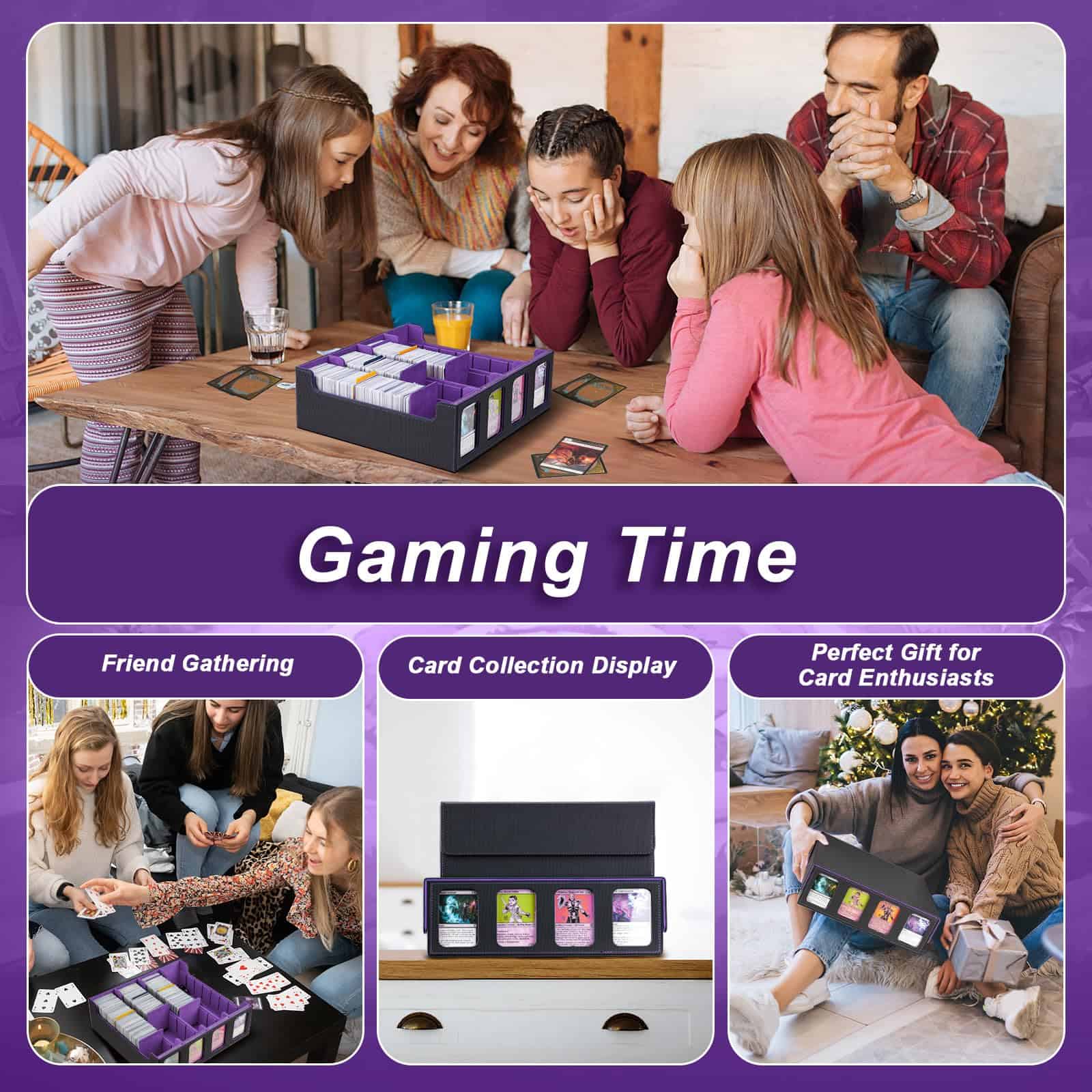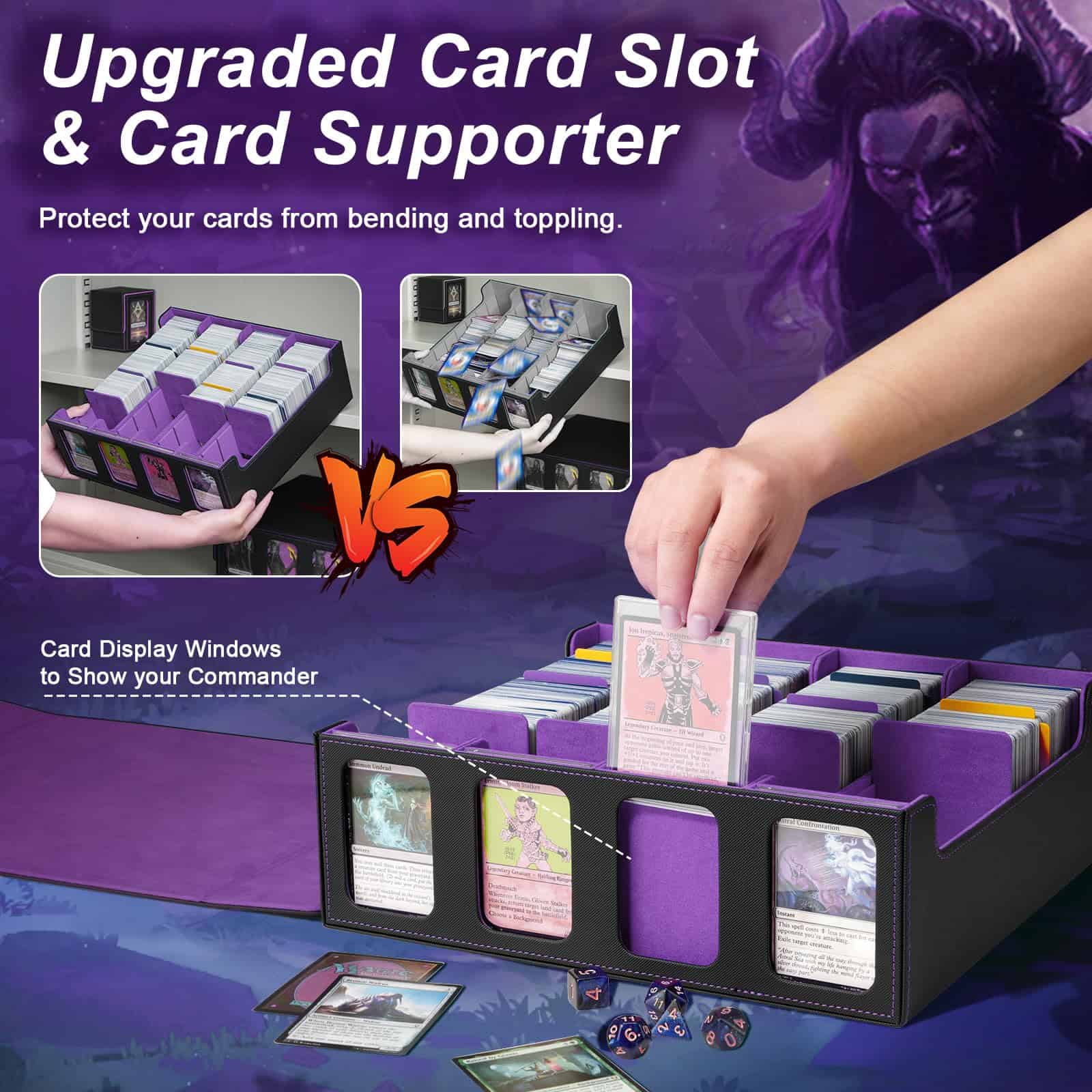 2. Nuevo slot de carta mejorado: Equipada con 4 soportes para cartas, cuando la caja de mazo de comandante no está llena, estos soportes aseguran que tus cartas permanezcan verticales, evitando colapsos de cartas en forma de dominó y daños por dobleces. Pueden proteger tus valiosas cartas en buen estado. Cuatro ventanas de visualización en el lado muestran tus cartas de comandante para identificar rápidamente el mazo.