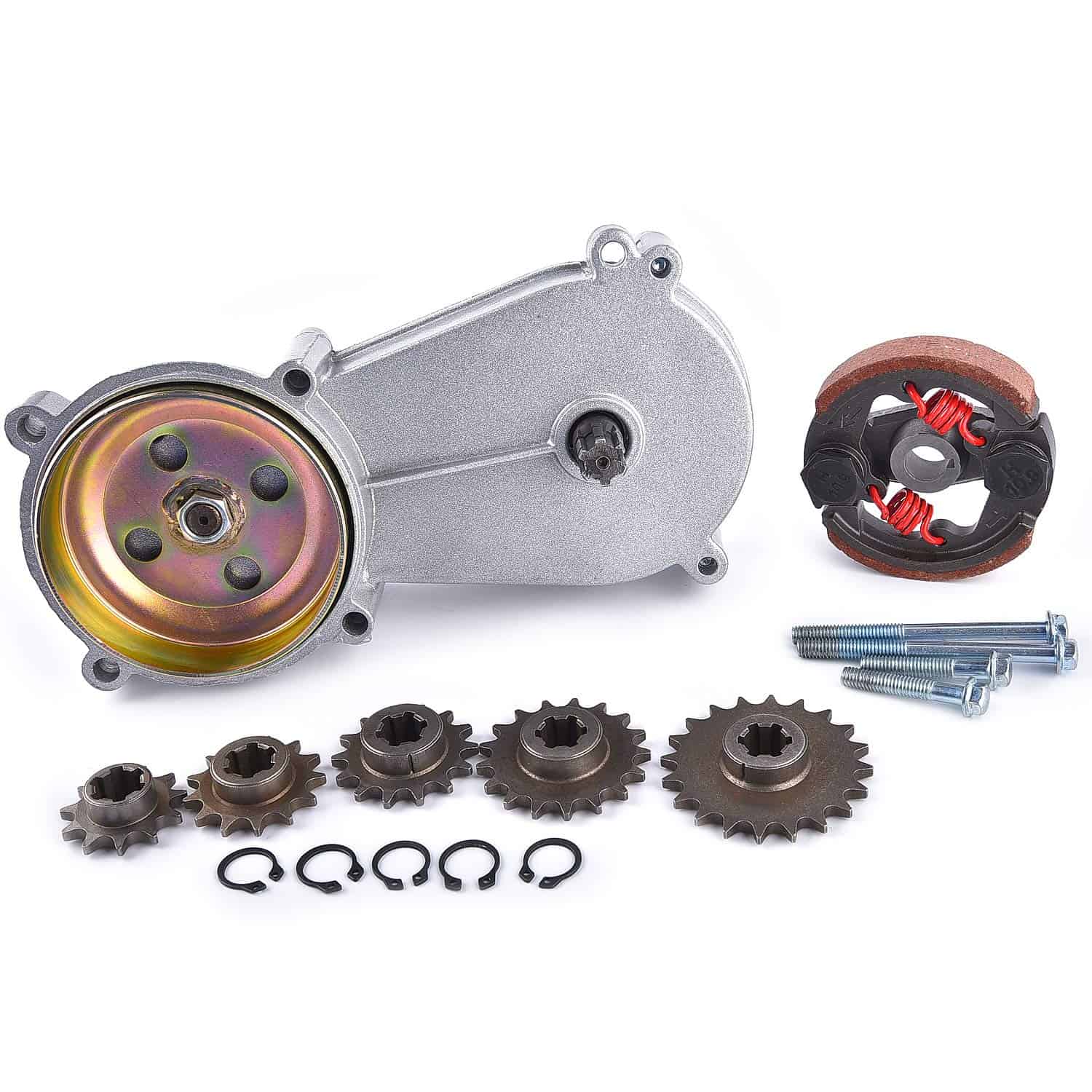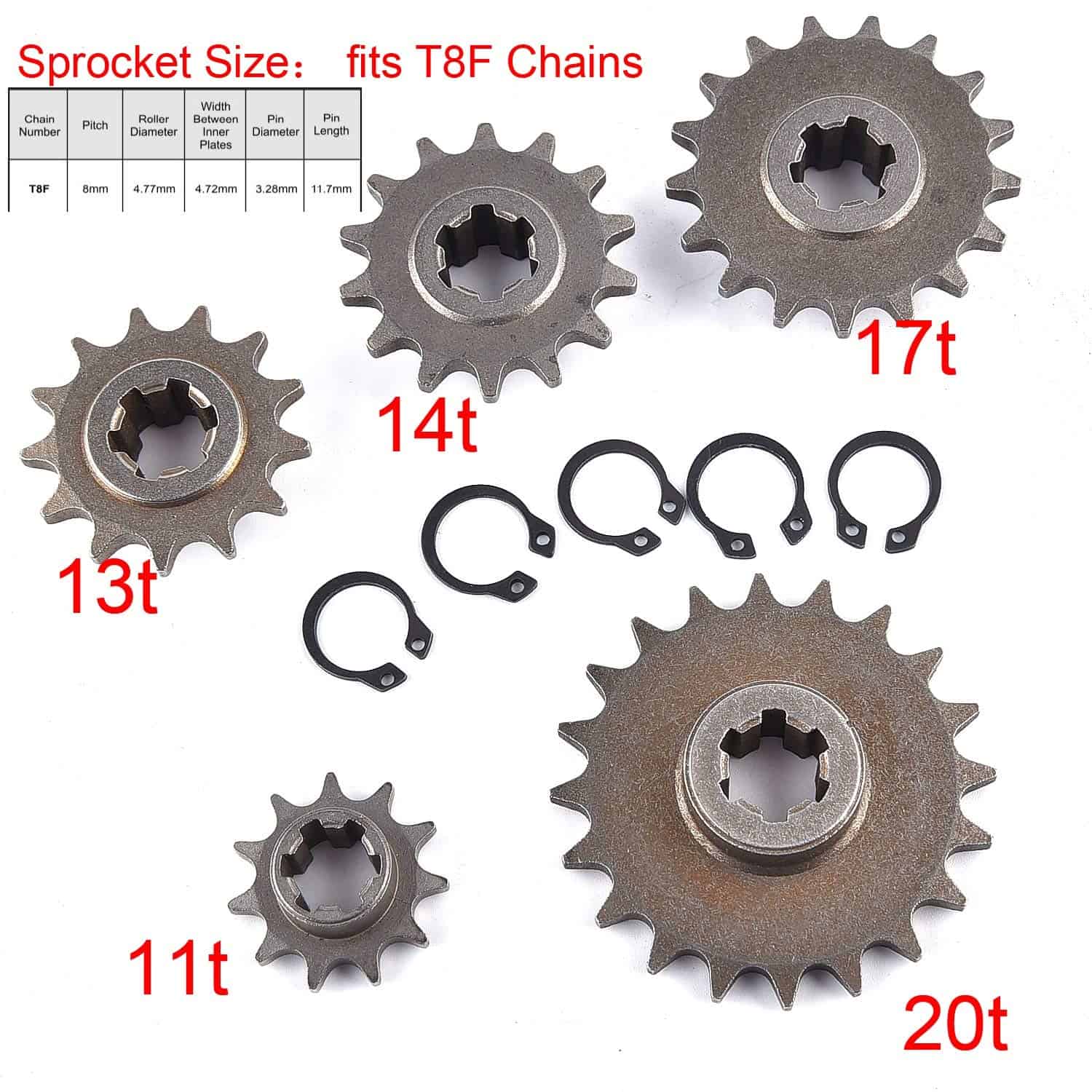 Caja de Reducción de Engranajes de Transmisión Reemplazo de Embrague para Mini Bicicletas de Bolsillo de 47cc 49cc 2 Tiempos T8F 11T 13T 14T 17T 20T Teeth Pocket Mini Bike. Esta caja de engranajes de transmisión y conjunto de embrague centrífugo es compatible con una amplia variedad de mini bicicletas de bolsillo de 2 tiempos de 43cc 47cc 49cc 50cc T8F, bicicletas de bolsillo, bicicletas de tierra, pit bike, scooter, ATV, go kart. Tiene una relación de reducción de 3 a 1 y el tamaño y las especificaciones se marcan claramente en la imagen. Adaptable a diferentes vehículos deportivos, permite elegir entre cinco piñones de tracción frontal disponibles para cinco tamaños diferentes, hechos para una cadena T8F. Fabricado con materiales de calidad y bajo los estándares industriales, el engranaje del piñón ha sido tratado térmicamente para resistir el desgaste. El kit se instala fácilmente con los accesorios incluidos: 1 x caja de reducción + 1 x embrague + piñones de tracción T8F 11T 13T 14T 17T 20T + 5 x clips de retención de acero para resortes