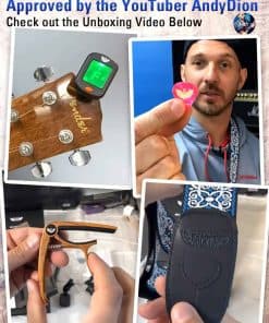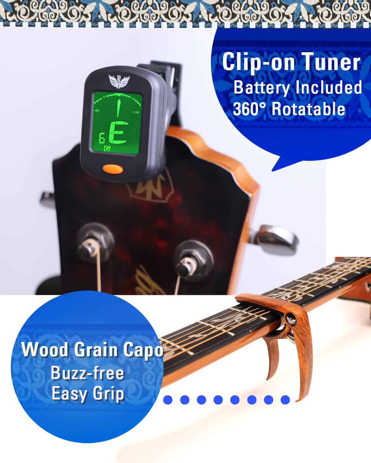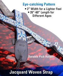 5. Afinador & Correa – El afinador de guitarra (batería incluida) es fácil de colocar en el mástil de cualquier instrumento y es práctico para afinar una guitarra, bajo, ukelele o violín. La correa tejida jacquard es una correa de guitarra bellamente bordada con portapúas de guitarra que permite el movimiento libre sin engancharse en la ropa. La correa premium tiene un ancho de 1.9″ y una longitud ajustable entre 35″ y 60″, diseñada para cualquier guitarrista, ya sea mujer, hombre o estudiante.