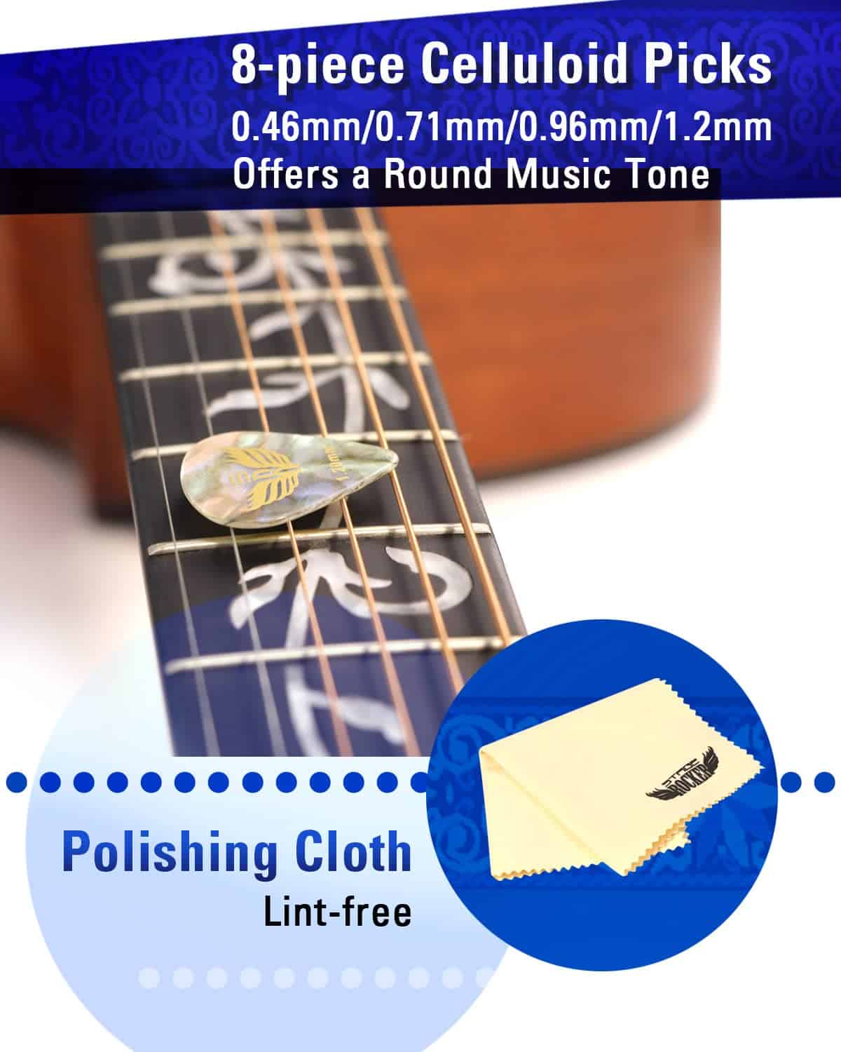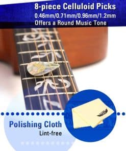 4. Capo & Púas & Paño – El capo de resorte resistente está diseñado para guitarras acústicas y eléctricas, ukeleles, bajos, violines y más. Las púas de celuloide vienen en 4 grosores diferentes (Delgado o Ligero: 0.46 mm / Medio: 0.71 mm / Pesado: 0.96 y 1.2 mm). Viene con 2 piezas de cada tamaño. La variedad de púas de guitarra es perfecta para los guitarristas que buscan redescubrir técnicas de guitarra. El paño de limpieza de microfibra está hecho de fibra de alta calidad para garantizar que tu instrumento permanezca libre de arañazos.