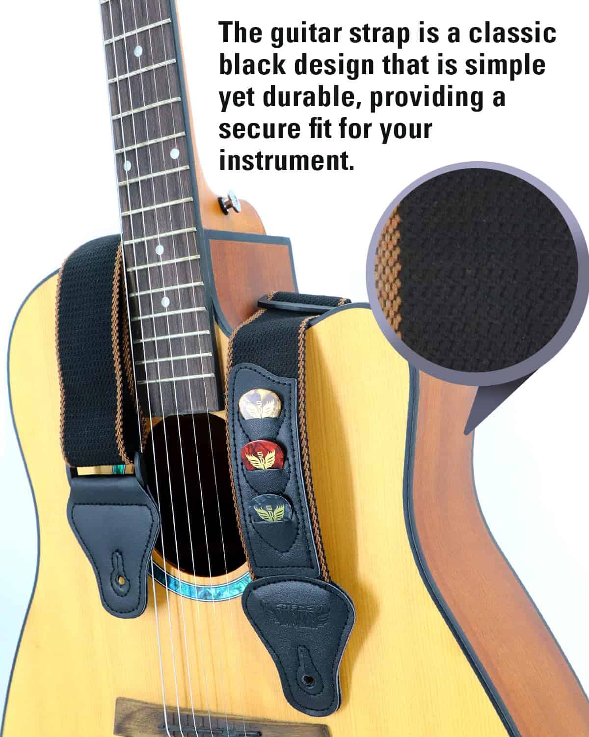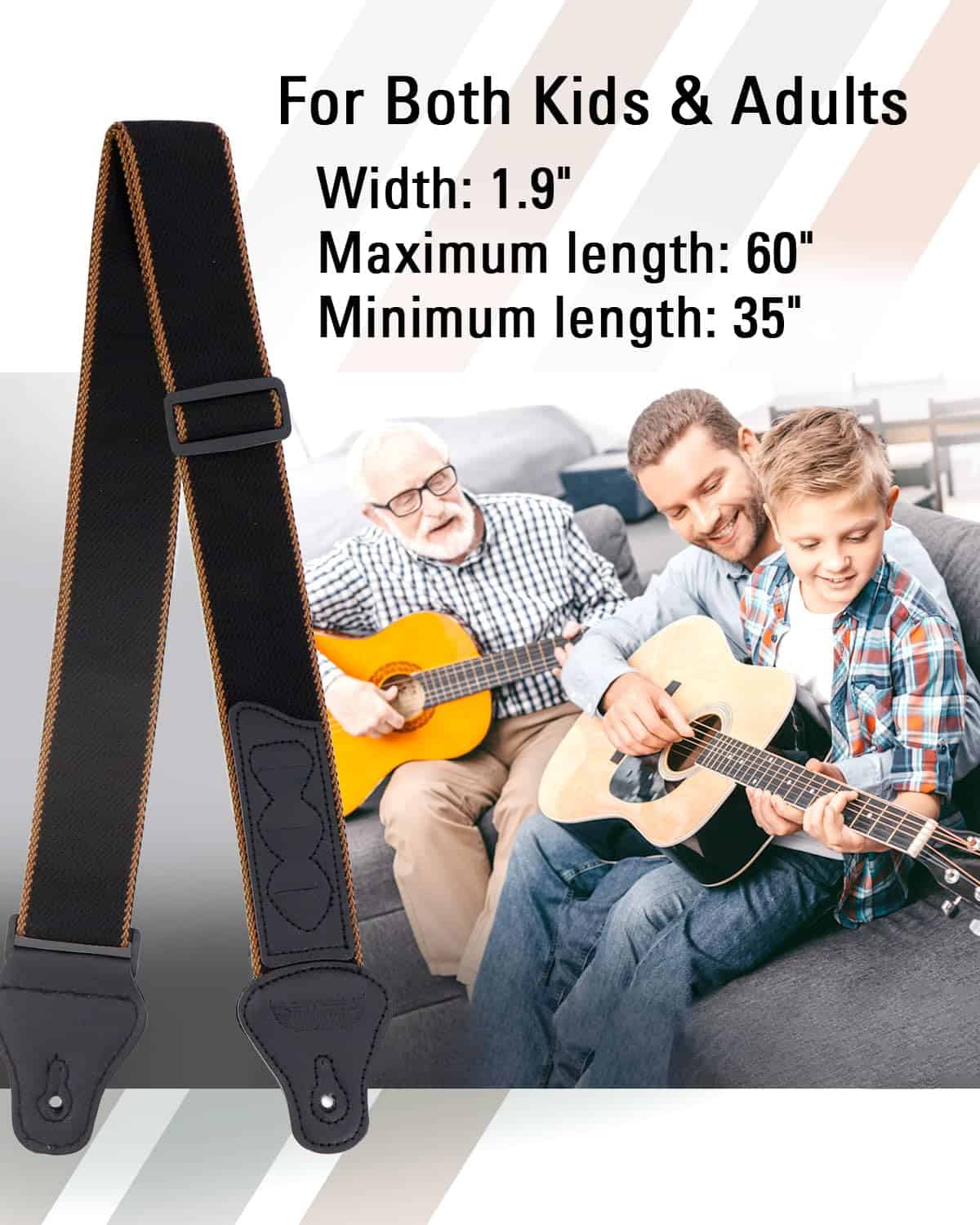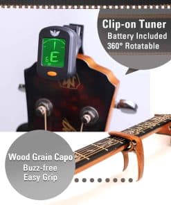 5. Afinador & Correa – El afinador de guitarra (una batería CR2032 incluida) es fácil de sujetar en el mástil de cualquier instrumento y es práctico para afinar una guitarra, bajo, ukelele o violín. La correa tejida jacquard es una correa de guitarra bellamente bordada con portapúas de guitarra que permite el movimiento libre sin engancharse en la ropa. Tiene un ancho de 1,9″ y una longitud ajustable entre 35″ y 60″, lo que garantiza un ajuste perfecto para cualquier guitarrista, ya sea mujer, hombre o estudiante.