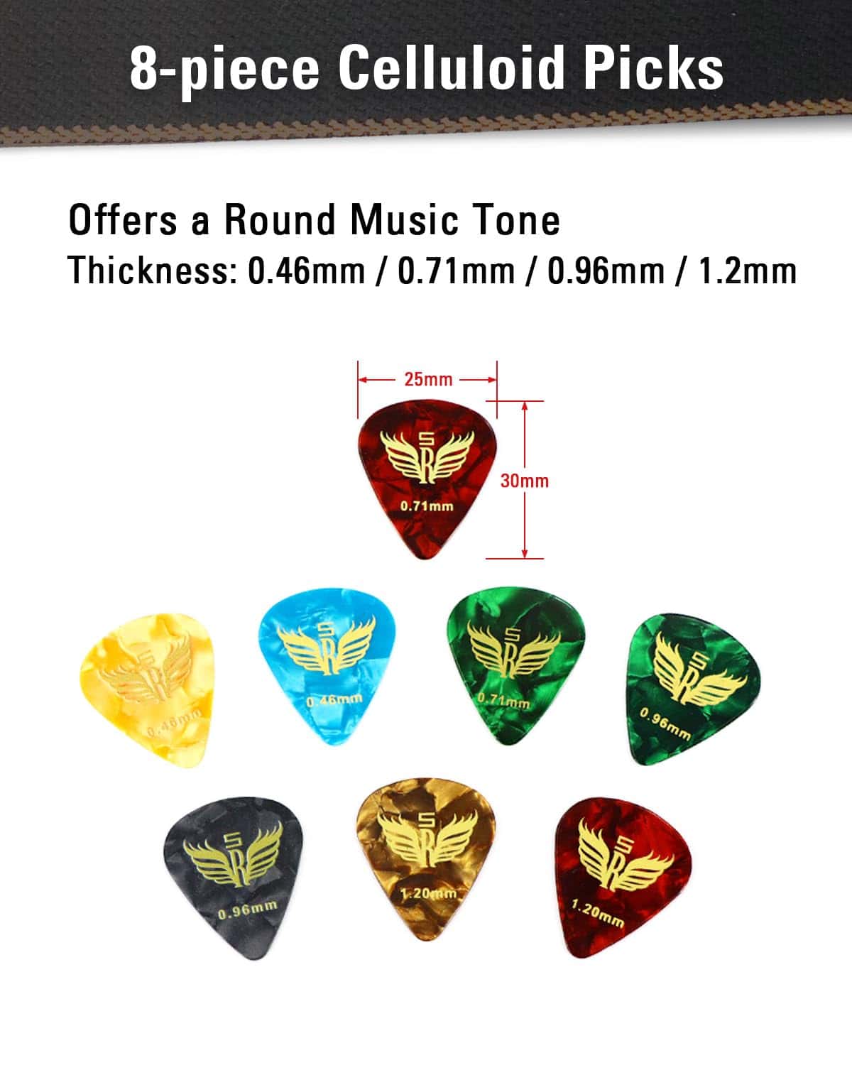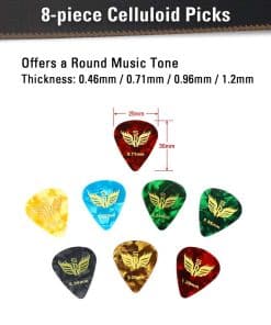 4. Capo & Púas & Paño – El capo de resorte fuerte está diseñado para guitarras acústicas y eléctricas, ukeleles, bajos, violines y más. Las púas de celuloide vienen en 4 grosoros diferentes (Delgadas o Ligeras: 0,46mm / Medias: 0,71mm / Pesadas: 0,96 y 1,2mm). Viene con 2 piezas de cada tamaño. La variedad de púas de guitarra es perfecta para guitarristas que buscan reencontrarse con técnicas de guitarra. El paño de limpieza de microfibra está hecho de fibra de alta calidad para asegurar que tu instrumento permanezca libre de rasguños.
